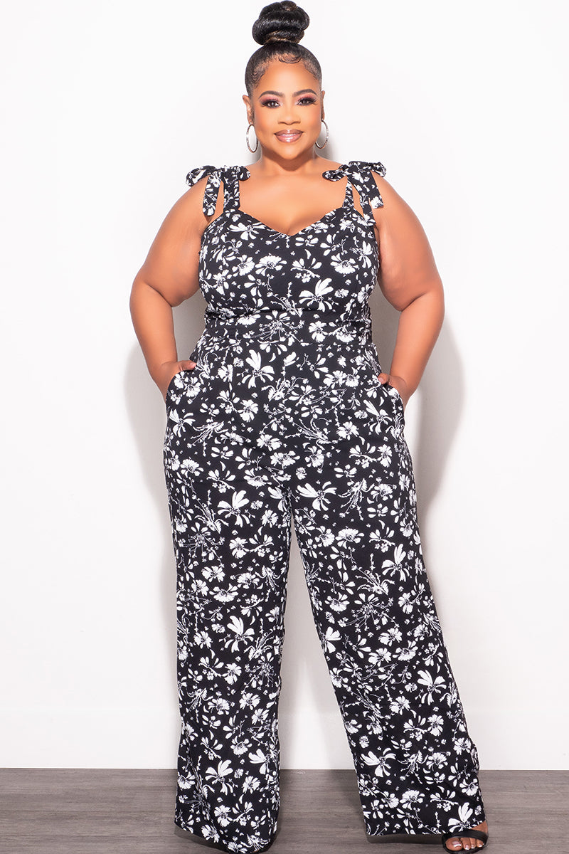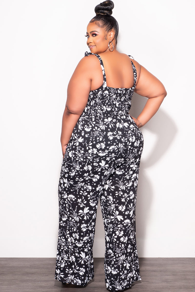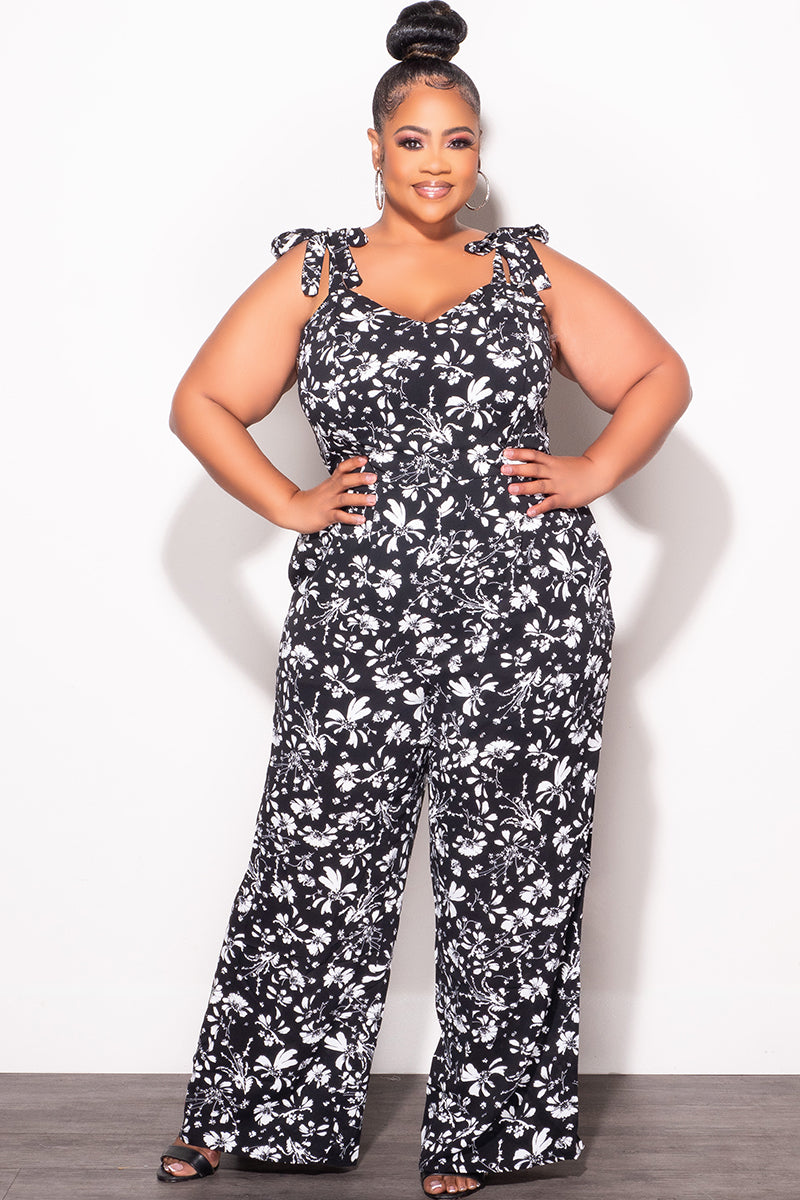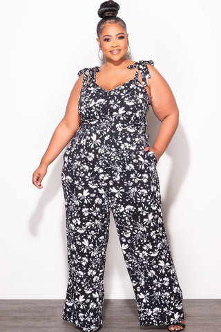 Final Sale Plus Sleeveless Jumpsuit with Tie Straps in Black and White Floral Print