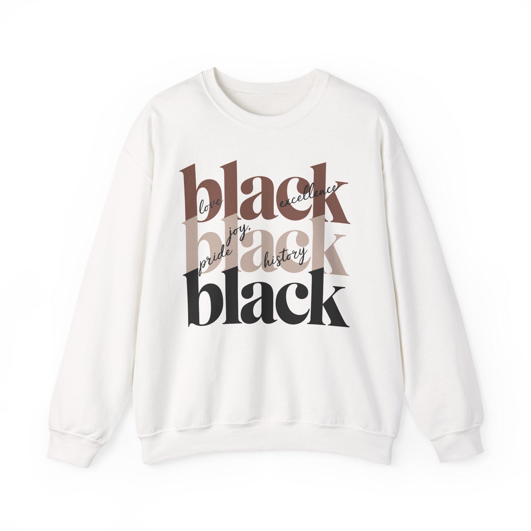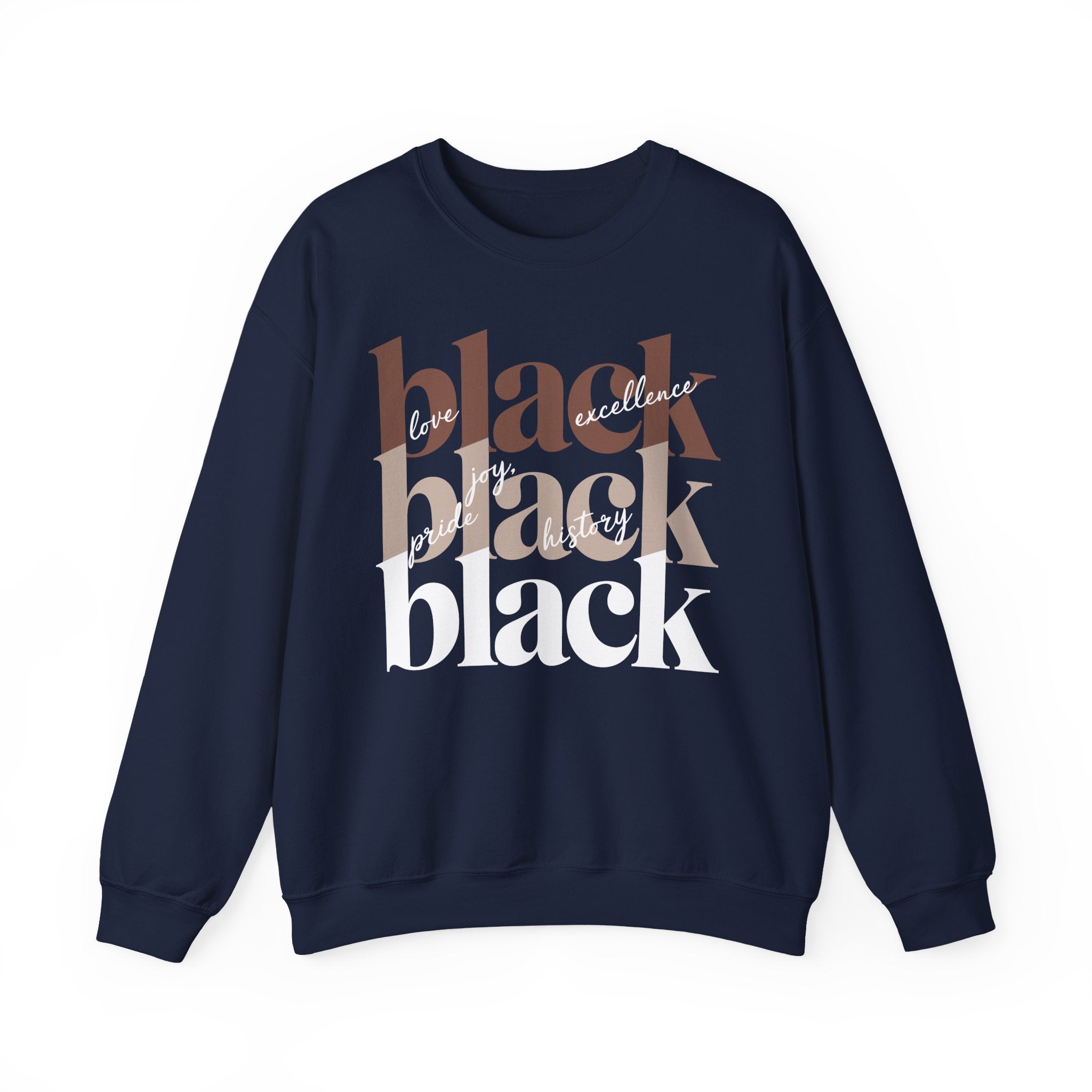 Slip into confident minimalism with this crewneck sweatshirt — a statement piece that celebrates strength, pride, and presence. The stacked “black” typography commands attention in rich earthy neutrals, layered with flowing script words like love, joy, excellence, pride, and history for added depth and meaning. The contrast against a dark base gives the design a refined, modern edge that feels powerful without being loud. Crafted from a medium-heavy cotton-poly blend, it delivers warmth and structure without sacrificing comfort. Finished with durable double-needle stitching and a ribbed collar that holds its shape, this sweatshirt is made for everyday wear — whether you’re out making moves, showing up for community moments, or keeping it effortlessly stylish on a casual day.Product features- Medium-heavy 50/50 cotton-poly blend (8.0 oz/yd²) for warmth and durability- Classic crew neckline with ribbed knit collar to retain shape- Double-needle stitching at shoulder, armhole, neck, waistband and cuffs for long-lasting wear- Embroidered or printed decoration options (DTG/DTF) with placement choices on chest or wrists- OEKO-TEX dyes and ethically sourced cotton; tubular knit reduces fabric wasteCare instructions- Machine wash: cold (max 30C or 90F)- Non-chlorine: bleach as needed- Tumble dry: low heat- Do not iron- Do not dryclean