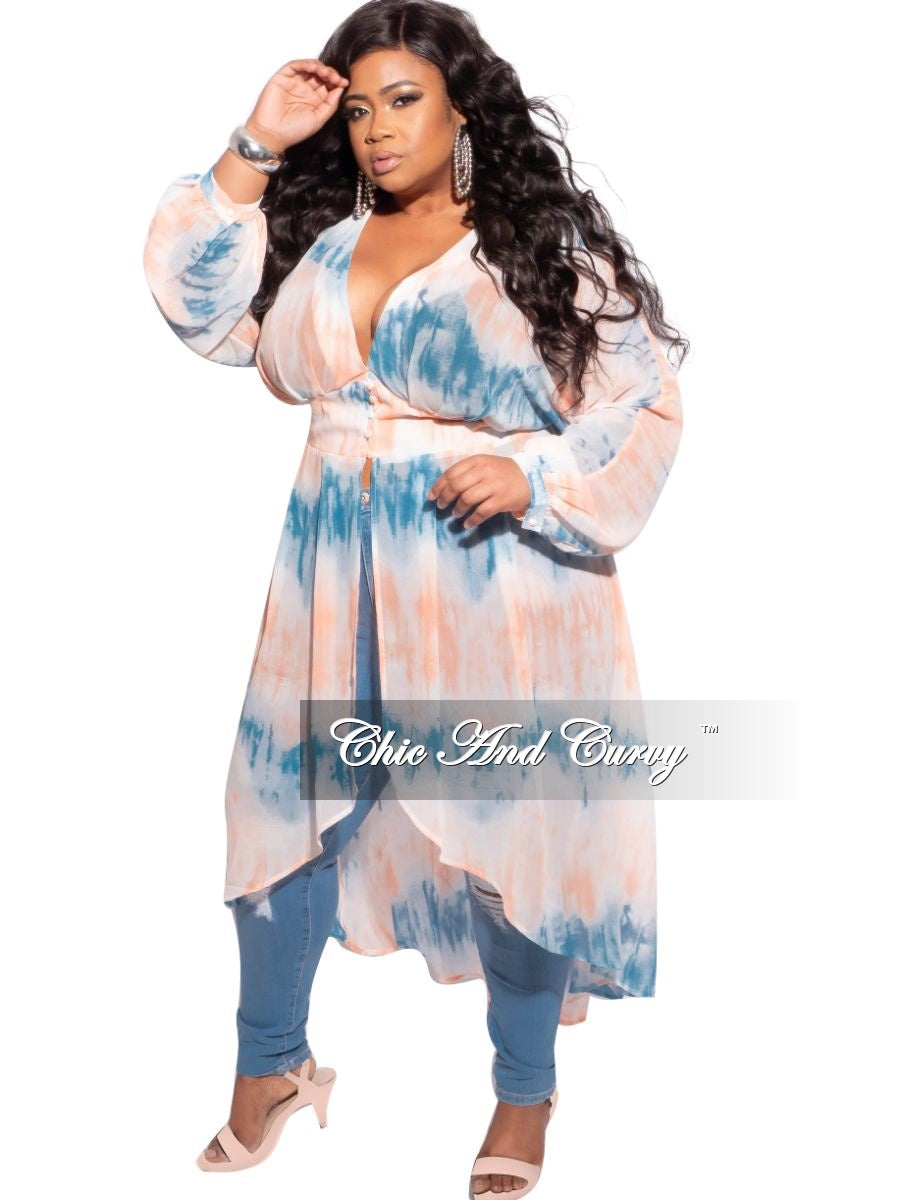 Final Sale Plus Size Faux Wrap Bell Sleeve High-Low Top in White, Blue, Peach Water Print
