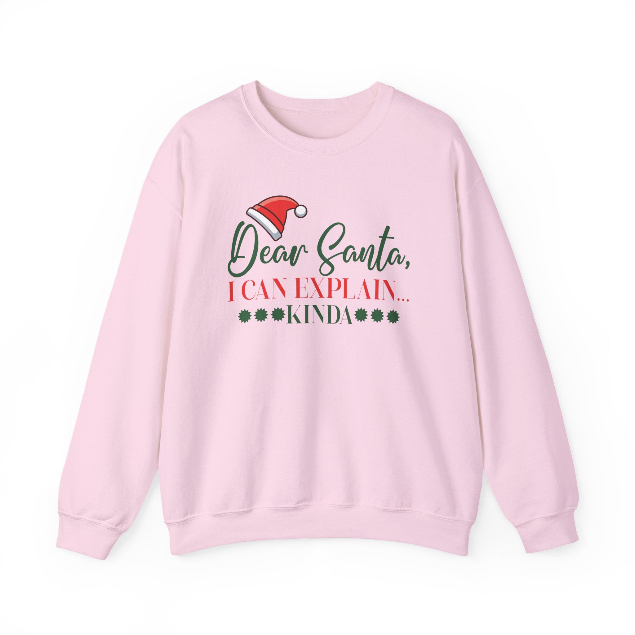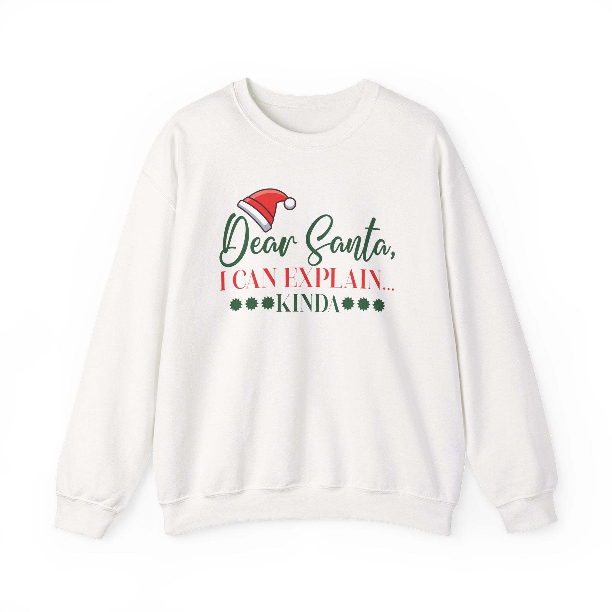 Soft, cozy, and a little bit cheeky — this classic crewneck brings holiday humor into everyday wear. The clean white sweatshirt features a playful “Dear Santa, I can explain... kinda” design with a tiny Santa hat accent, giving it a lighthearted, slightly mischievous vibe. Layer it over a tee on frosty mornings or wear it around the house with warm socks while wrapping gifts. The medium-heavy cotton-poly blend feels substantial without being stiff, and the ribbed collar and cuffs keep the shape wash after wash. It’s a relaxed piece for anyone who likes to celebrate the season with a wink and comfortable style.Product features- Tubular knit (no side seams) for a smooth, waste-reducing finish- 8.0 oz/yd² 50/50 cotton-poly blend for durable comfort (Heather Sport: 60% polyester/40% cotton)- Ribbed knit collar and double-needle stitching for shape retention and long-lasting seams- Embroidery options on chest or wrists; DTF inner neck labels and DTG print for crisp graphics- OEKO-TEX dyes and ethically sourced US cotton; meets safety and compliance standardsCare instructions- Machine wash: cold (max 30C or 90F)- Non-chlorine: bleach as needed- Tumble dry: low heat- Do not iron- Do not dryclean