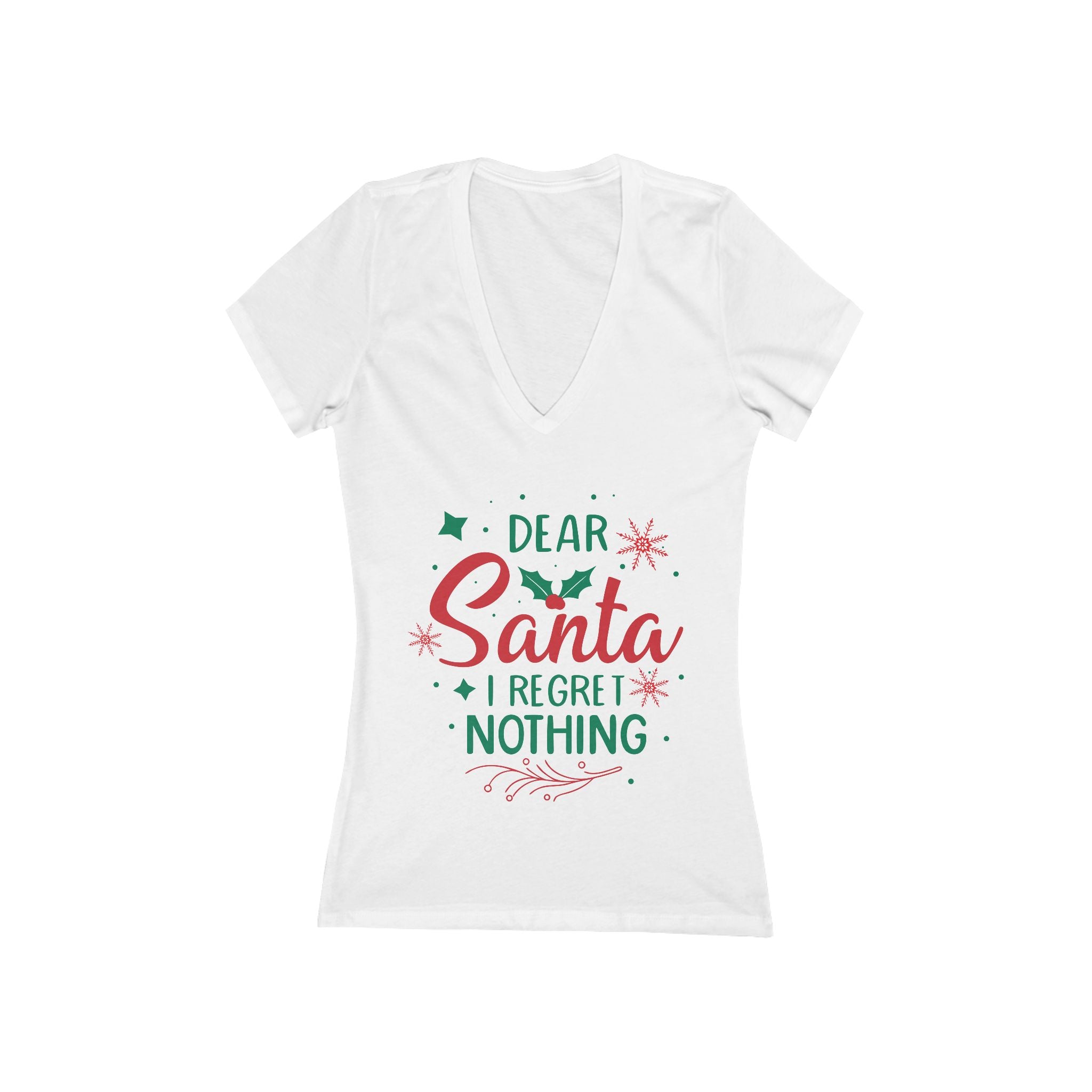 A slim-fit deep V-neck tee with playful holiday lettering that reads "Dear Santa I Regret Nothing." Lightweight and soft against the skin, it drapes close to the body for a flattering silhouette. The graphic mixes festive greens and reds with small holly and spark accents, giving a cheeky, confident holiday vibe. Wear it layered under a cardigan or on its own for casual winter parties, cookie-baking afternoons, or relaxed family gatherings where a little humor is welcome.Product features- Side seams for better shape retention and structure- Ribbed knit collar with seam for stretch and collar stability- Shoulder tape to prevent seam stretching and stabilize the back- Lightweight fabric (4.2 oz/yd²) in a slim fit — runs smaller than usual- Fiber composition varies by color; solid options are 100% Airlume cotton with a sewn-in labelCare instructions- Machine wash: warm (max 40C or 105F)- Non-chlorine: bleach as needed- Tumble dry: low heat- Iron, steam or dry: medium heat- Do not dryclean