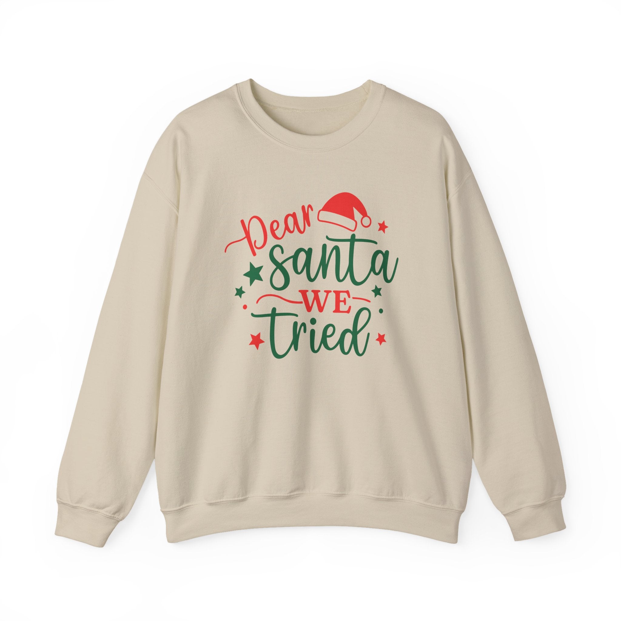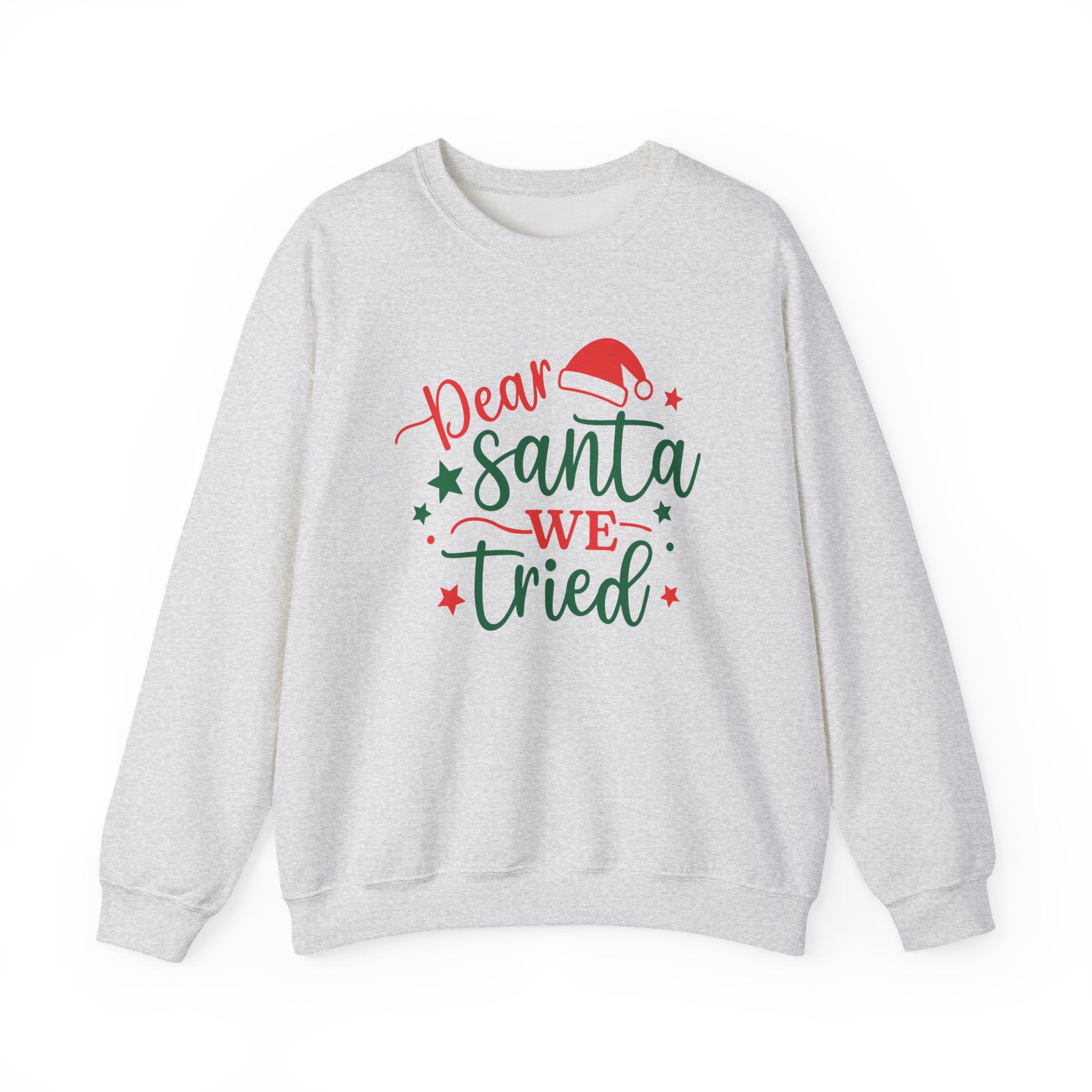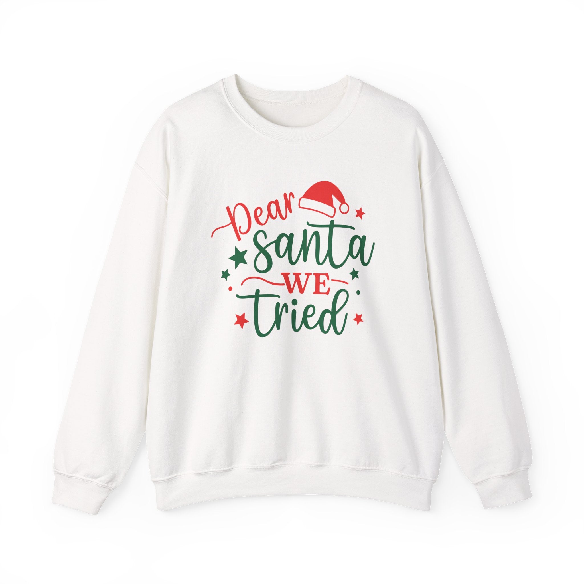 A soft, cozy crewneck that carries a playful holiday spirit. Lightweight yet warm, it wears like a favorite sweatshirt — roomy through the shoulders and body with ribbed cuffs and hem that hold their shape. The white backdrop showcases a hand-lettered festive design in red and forest green, complete with a Santa hat and tiny stars, giving a cheerful, slightly cheeky vibe meant to spark smiles at gatherings or low-key seasonal outings. Durable double-needle stitching and a tear-away neck label keep comfort long after the season; ethically sourced cotton and OEKO‑TEX dyes make it feel as good as it looks.Product features- Tubular knit (no side seams) for a smooth, waste-reducing construction- 50/50 cotton‑polyester medium‑heavy (8 oz/yd²) fabric for warmth and durability- Ribbed knit collar, cuffs, and hem to retain shape- Double-needle stitching at seams for long-lasting wear- Embroidered and printed decoration options with DTF inner labels and OEKO‑TEX certified dyesCare instructions- Machine wash: cold (max 30C or 90F)- Non-chlorine: bleach as needed- Tumble dry: low heat- Do not iron- Do not dryclean