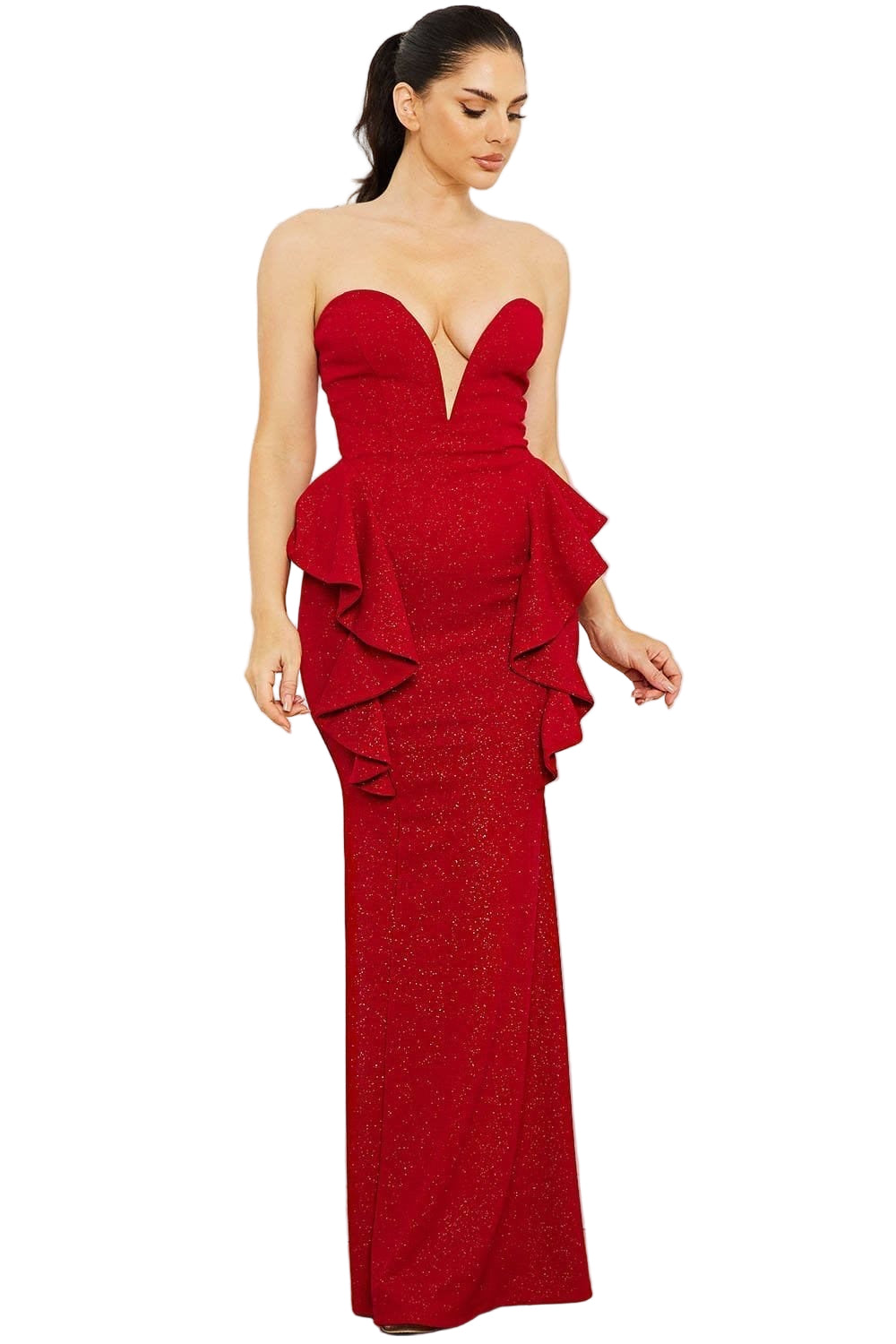 Final Sale Strapless Deep V Glitter Gown with Side Ruffles in Red