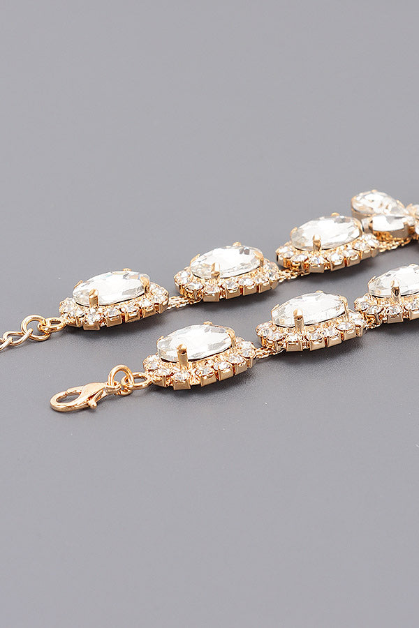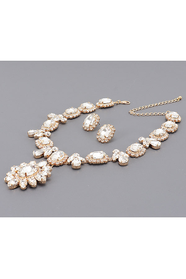 * This Multi Stone Necklace Set features an elaborate design. The necklace showcases a series of large, sparkling stones in intricate metal settings, complemented by matching stud earrings. The stones are arranged in a flowing pattern, with a prominent, ornate pendant at the center, creating a luxurious and eye-catching ensemble.