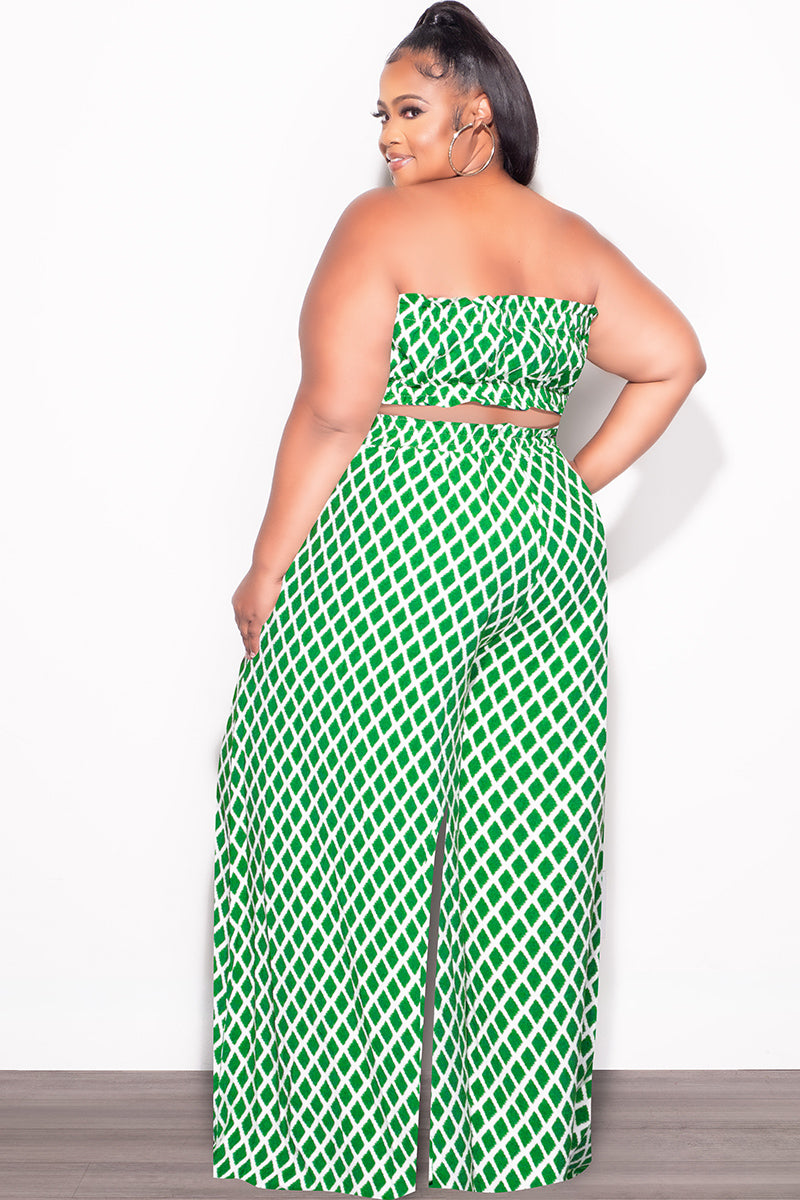 Final Sale Plus Size 2pc Strapless Crop Top and Flare Pants Set In Green & White Print