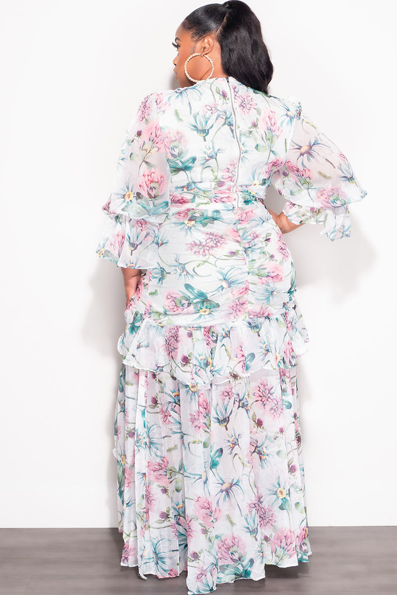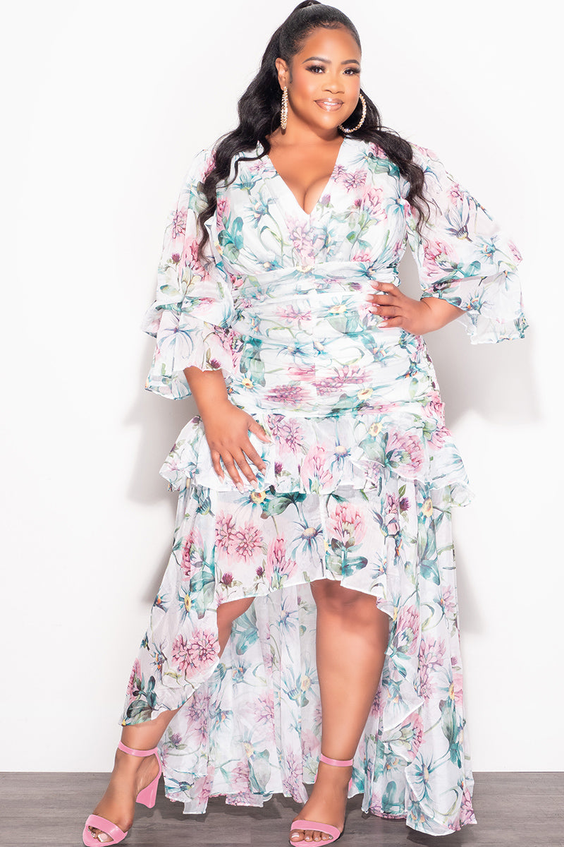 Final Sale Plus Size 2pc Chiffon Long Sleeve Crop Top and Highlow Ruffle Layered Skirt Set in Multi Color Floral Print
