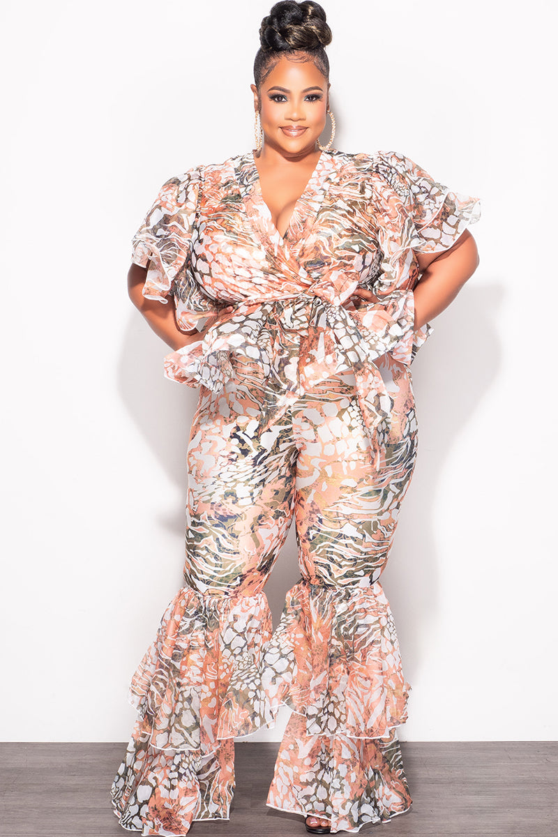 Final Sale Plus Size 2pc Faux Wrap Top and High Waist Legging Ruffle Pants in Multicolor Print