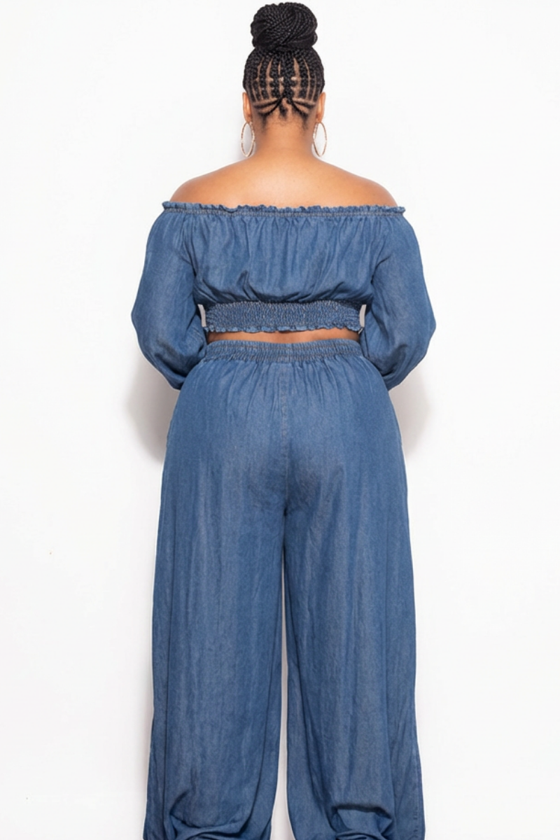 Final Sale Plus Size 2pc Set Off The Shoulder Top & Palazzo Pants in Wash Denim