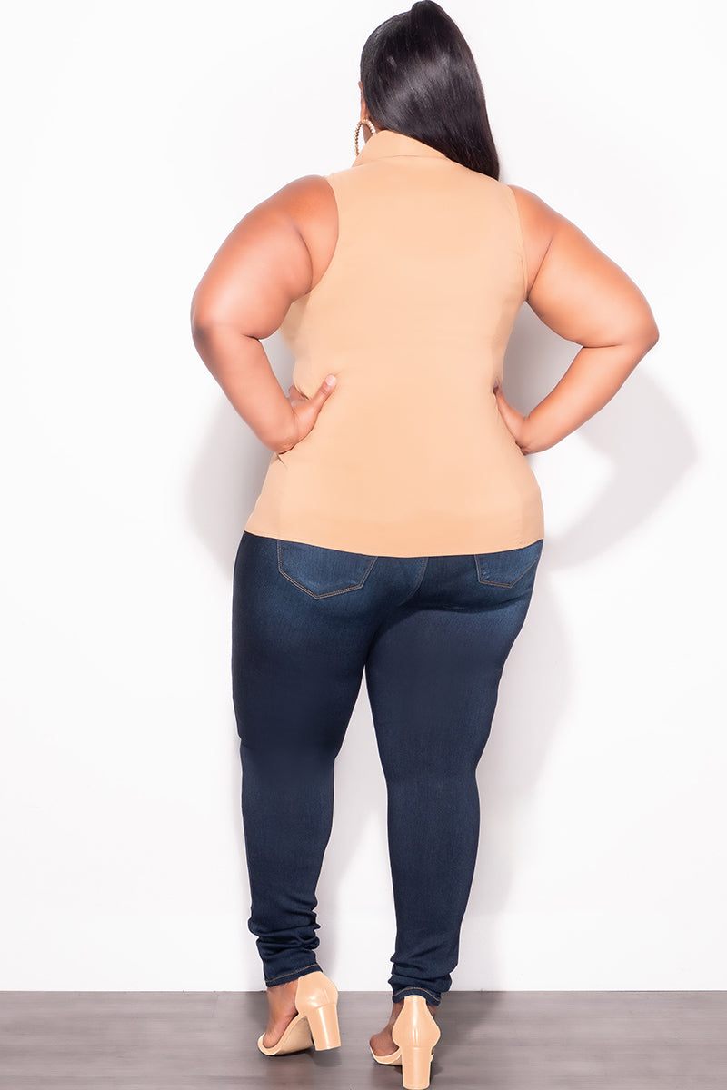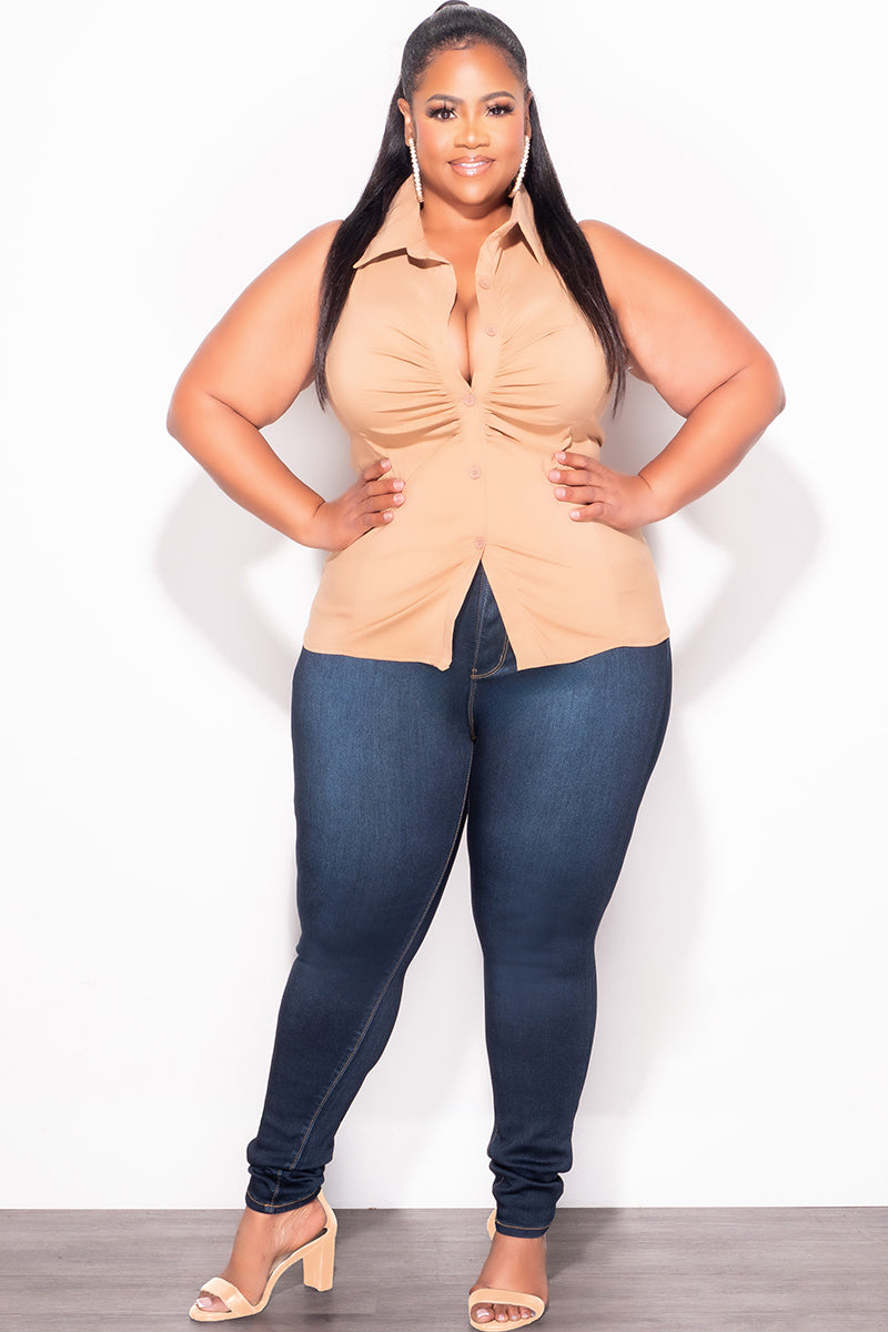 Final Sale Plus Size Sleeveless Collar Button Up Ruched Top in Cappuccino