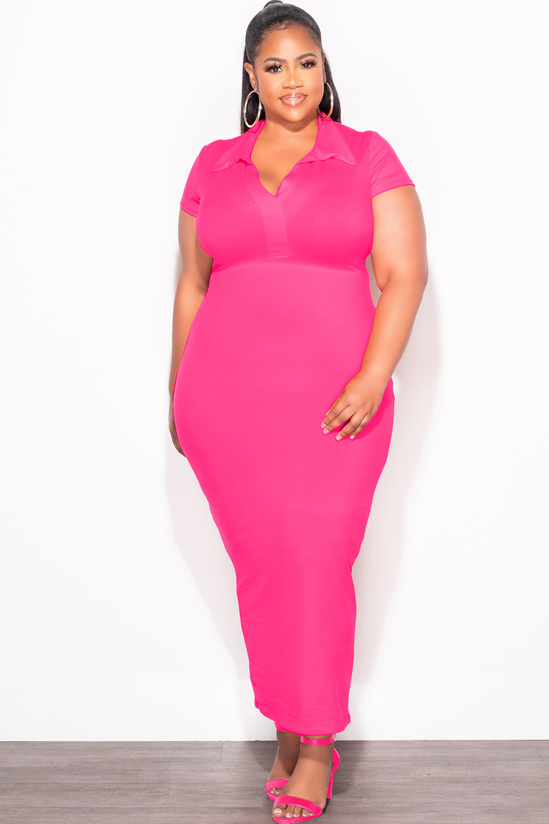 Final Sale Plus Size Collar V Neck Midi Dress in Pink