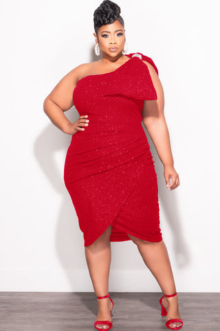 Final Sale Plus Size Glitter One Shoulder Ruched Dress Bow in Red
