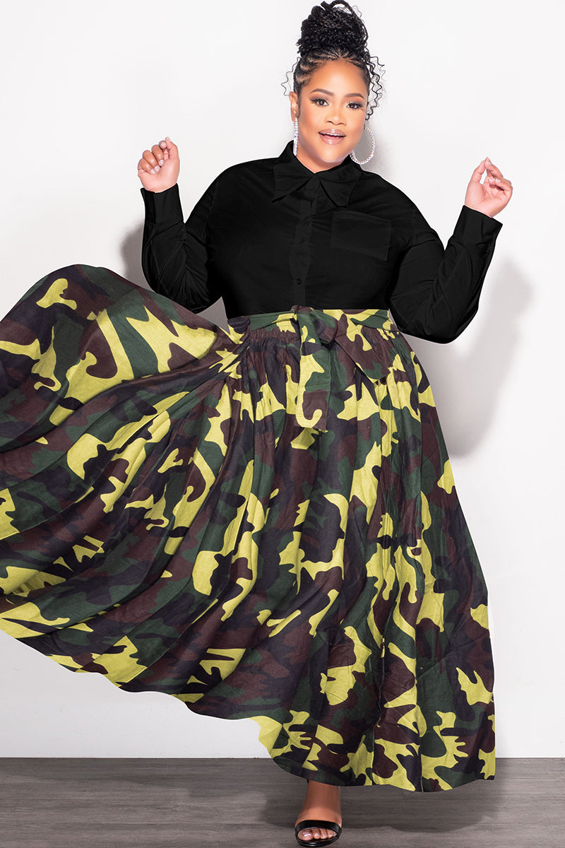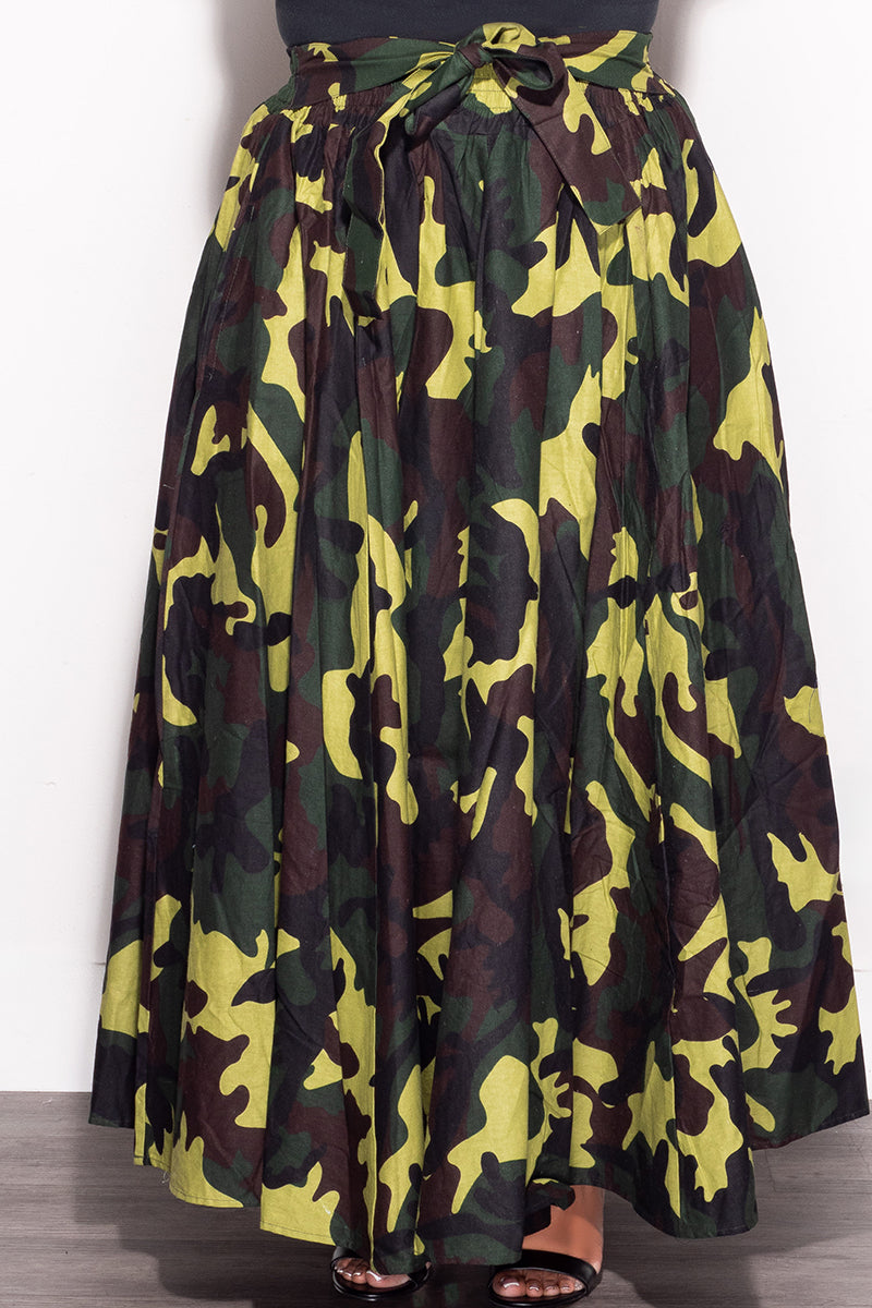 Final Sale Plus Size High Waist Maxi Skirt with Tie in Camouflage Print