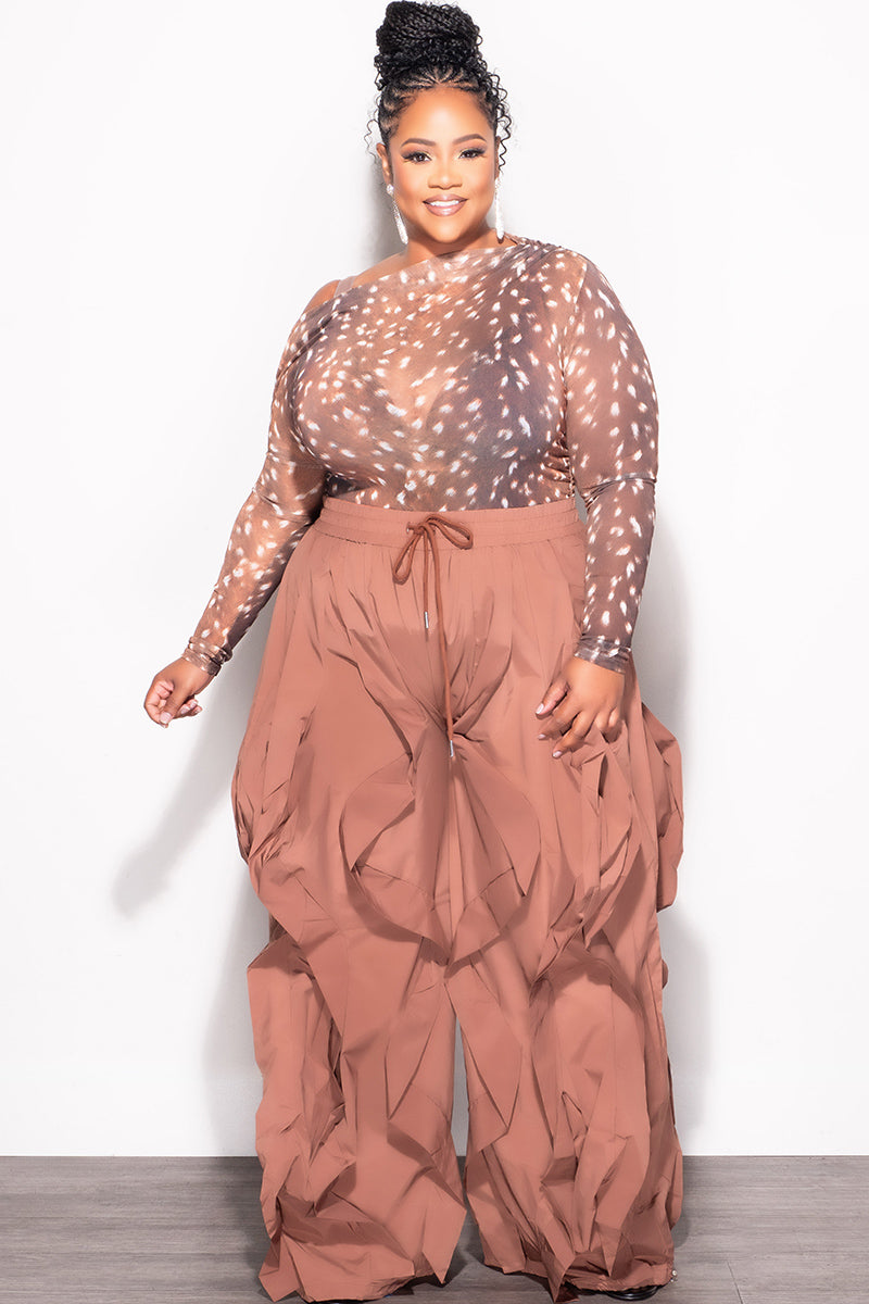 Final Sale Plus Size Wide Leg Drawstring Oversized Windbreaker Wavy Pants in Brown
