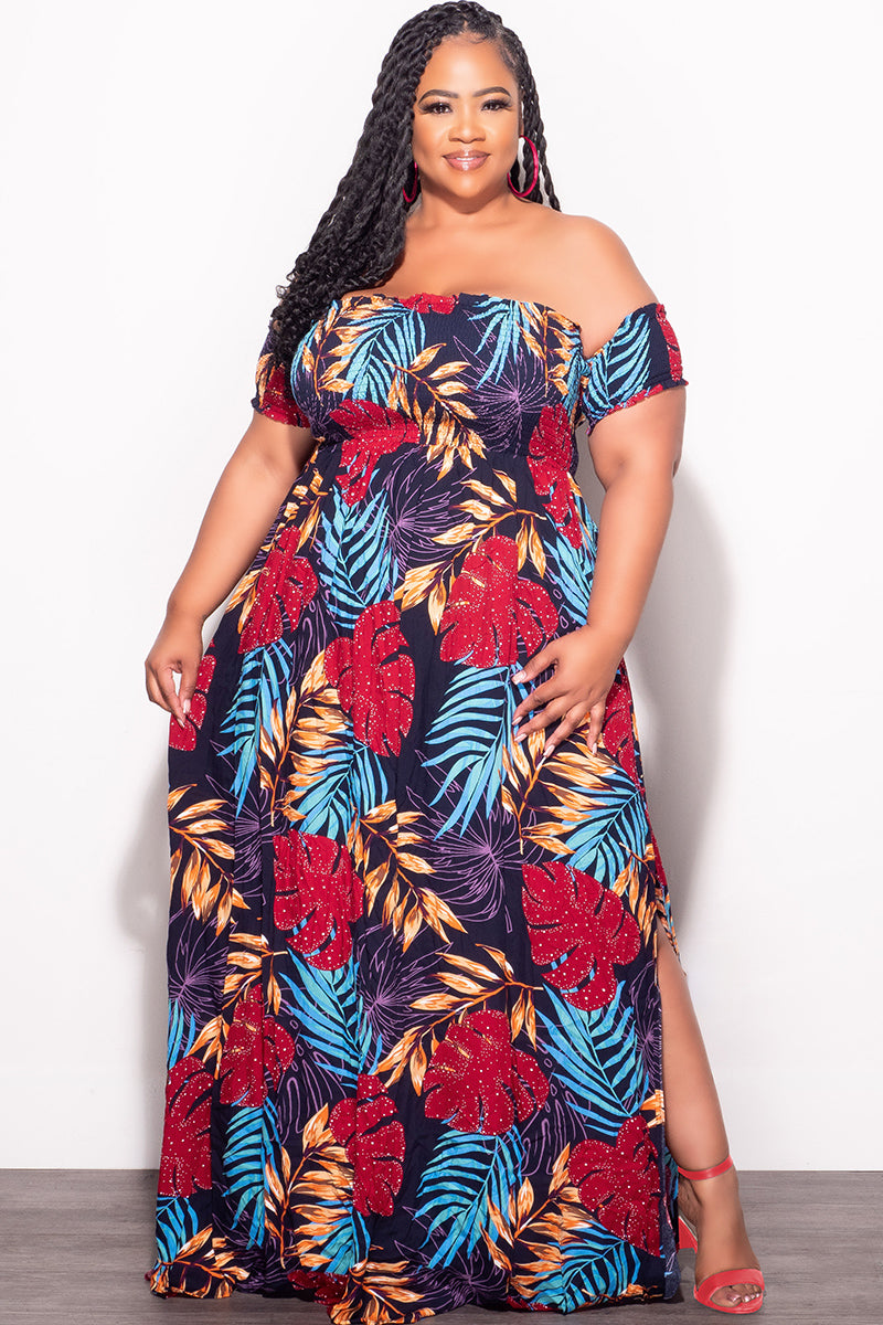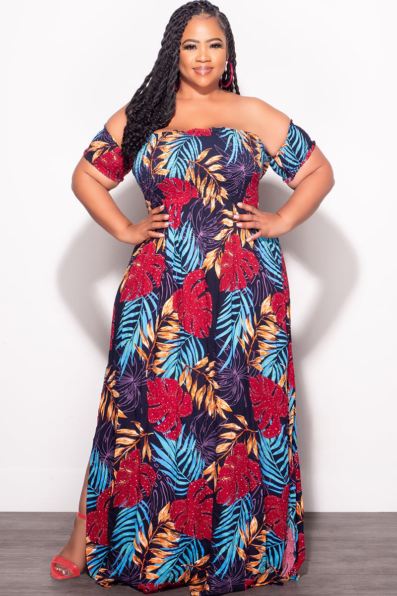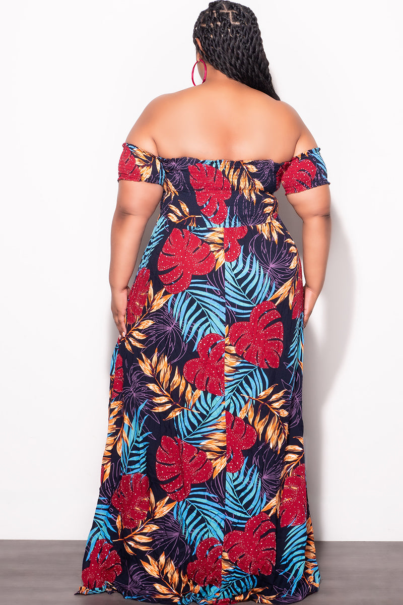 Final Sale Plus Size Sleeveless Frill Tiered Maxi Dress in Multi Color Leaf Print