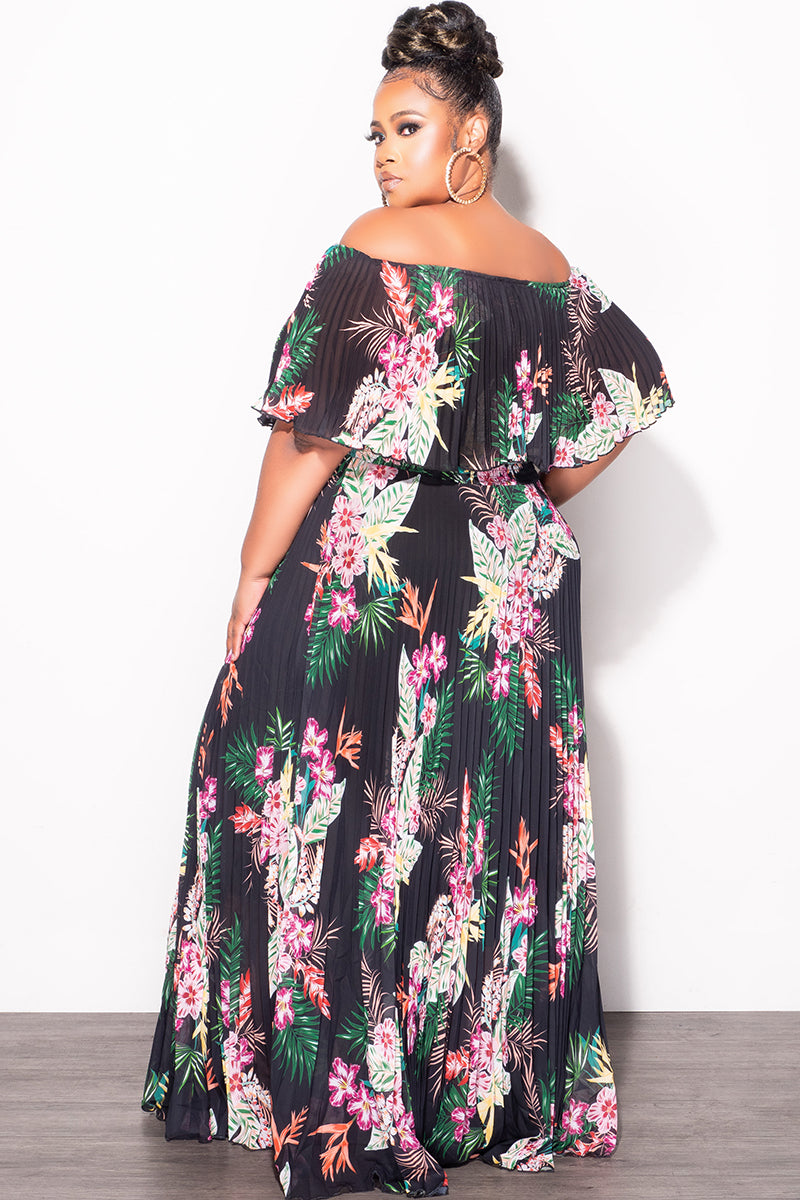Final Sale Plus Size Strapless Chiffon Pleated Long Dress in Black Floral Print