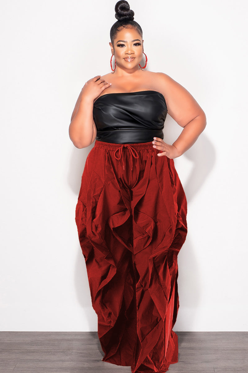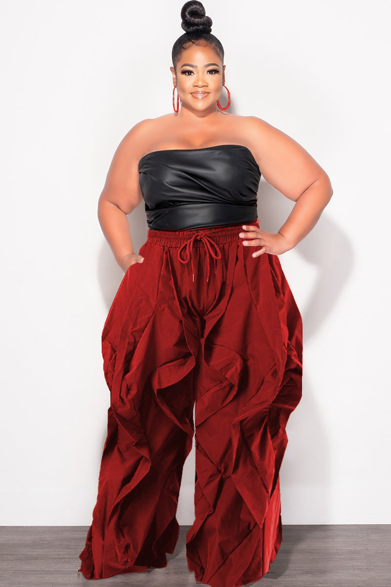 Final Sale Plus Size Wide Leg Drawstring Oversized Windbreaker Wavy Pants in Dark Red