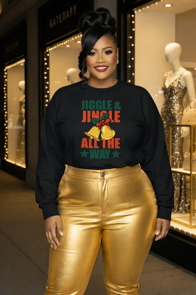 Wrap yourself in cozy holiday cheer with this classic crewneck sweatshirt. The soft 50/50 cotton–poly blend and medium-heavy weight give it a snug, lived-in feel that holds up through cold nights and repeated washes. A playful, vintage-inspired graphic — bells, holly, and bold green-and-red lettering reading “Jiggle & Jingle All The Way” — sits on the front, bringing a lighthearted, festive vibe without feeling overdone. The clean crew neckline and classic fit make it easy to layer over shirts or under a coat for caroling, cocoa runs, or relaxed family gatherings. Subtle details like ribbed cuffs and waistband, double-needle stitching, and tear-away label keep comfort and durability front and center. Ethically sourced cotton and OEKO-TEX certified dyes mean it’s made with attention to quality and safety.Product features- 50/50 cotton–poly medium-heavy (8.0 oz/yd²) fabric for warmth and durability- Classic crewneck fit with ribbed collar, cuffs, and waistband- Durable double-needle stitching at seams for long-lasting wear- Embroidered and printed decoration options; DTF inner neck labels and DTG print for graphics- OEKO-TEX certified dyes and ethically sourced US cotton; made in NicaraguaCare instructions- Machine wash: cold (max 30C or 90F)- Non-chlorine: bleach as needed- Tumble dry: low heat- Do not iron- Do not dryclean