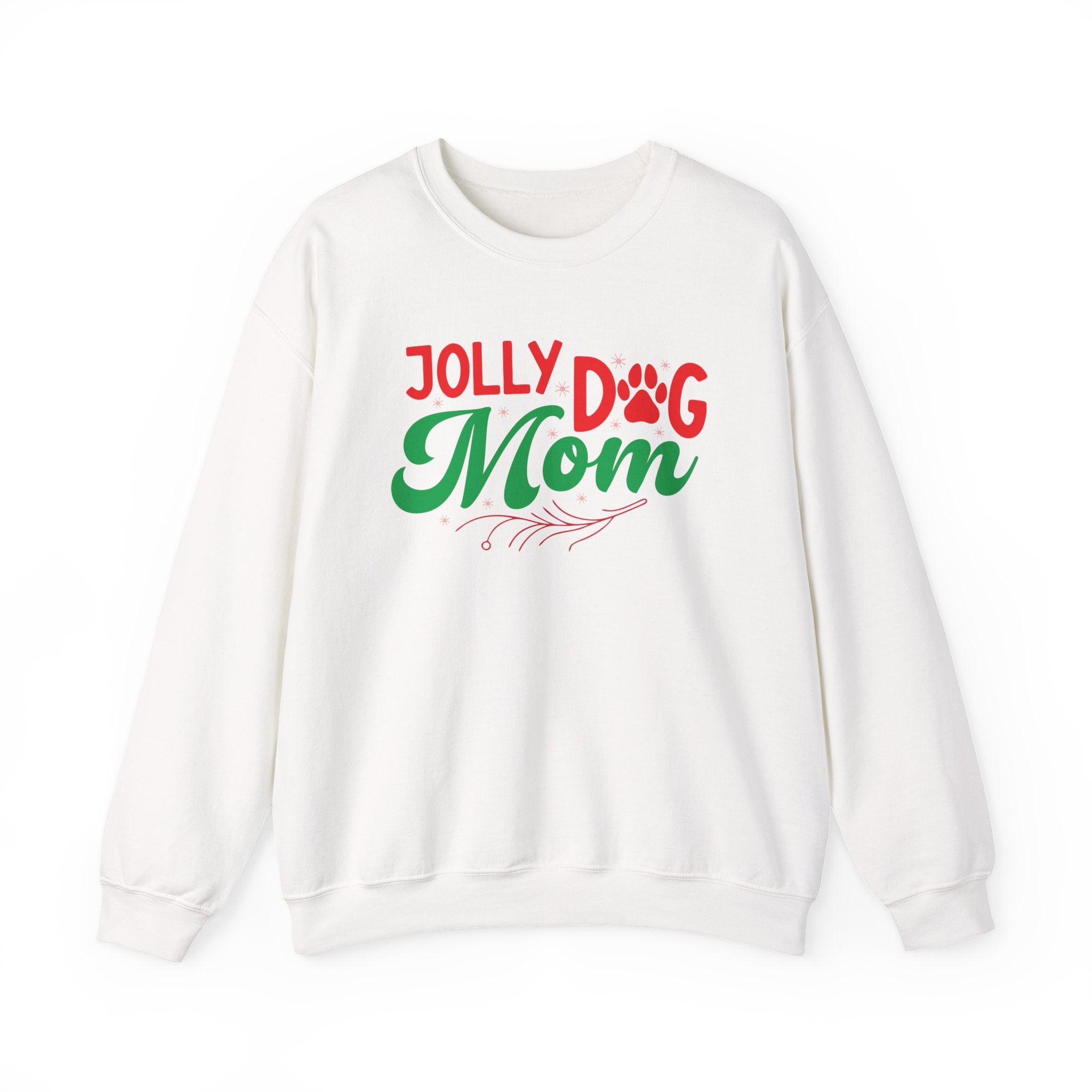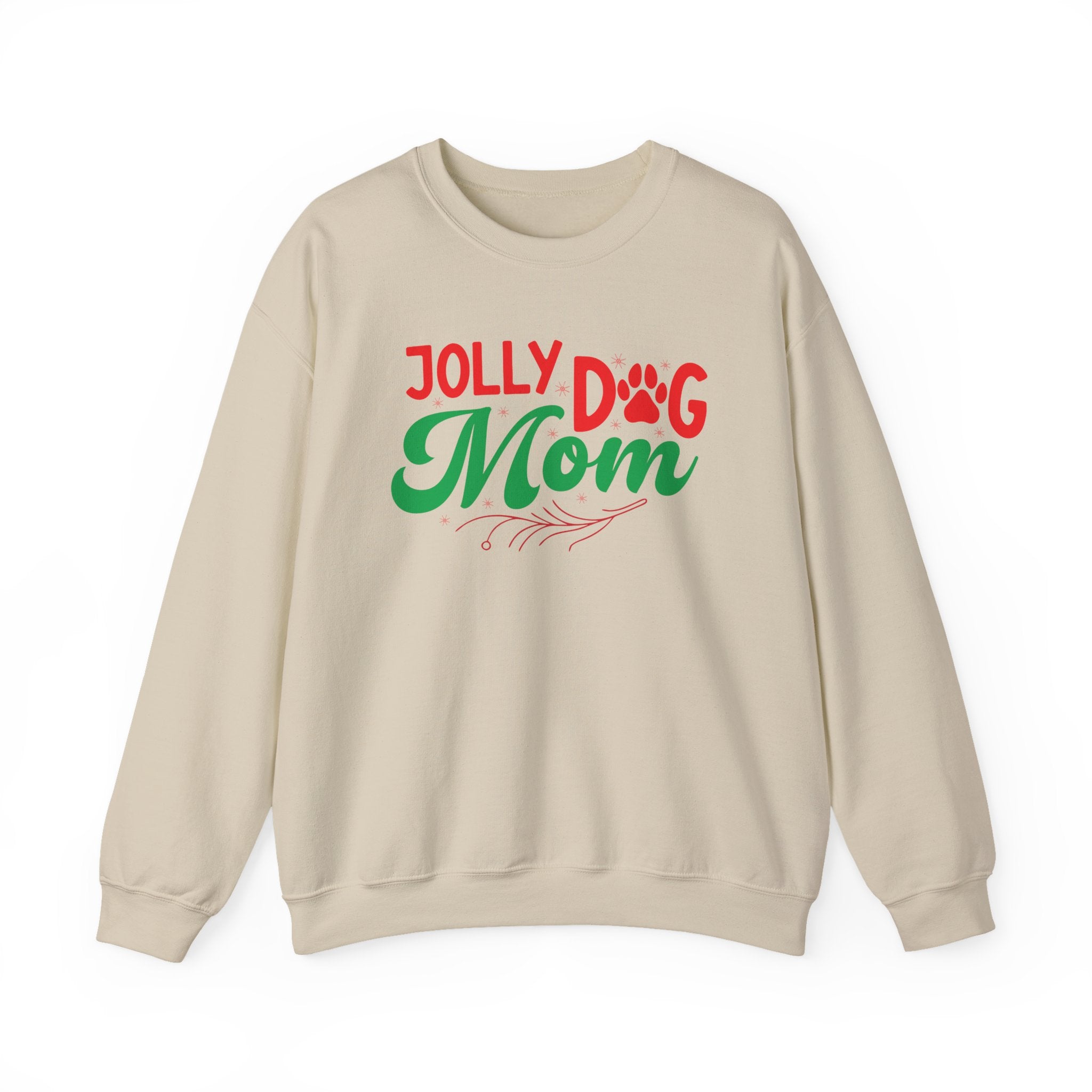Slip into holiday warmth with this cozy crewneck made for dog moms who celebrate with a wagging tail. The soft, medium‑heavy cotton-poly blend feels plush against the skin while the classic crew silhouette keeps the look relaxed and easy to layer. The playful “Jolly Dog Mom” artwork mixes bright red and evergreen script with a pawprint accent—subtle seasonal cheer that reads like a private nod to long walks, frosty noses, and living room cuddle sessions. Durable double-needle seams and a ribbed collar hold their shape through wash after wash, and the tear-away label keeps the neckline irritation-free. Wear it on brisk morning strolls, during low-key holiday gatherings, or while wrapping presents and sipping cocoa—this sweatshirt settles into the everyday moments that matter.Made with responsibly sourced cotton and OEKOTEX-safe dyes, it’s built to last and made with care.Product features- 50/50 cotton-poly medium-heavy (8 oz/yd²) blend for warmth and durability- Classic crew neckline with ribbed knit collar that retains shape- Double-needle stitching at shoulders, armholes, neck, waistband, and cuffs for long-lasting wear- Tear-away inner label and DTF inner neck prints for comfort- Embroidery available and printed graphics made with DTG; meets safety and environmental standardsCare instructions- Machine wash: cold (max 30C or 90F)- Non-chlorine: bleach as needed- Tumble dry: low heat- Do not iron- Do not dryclean