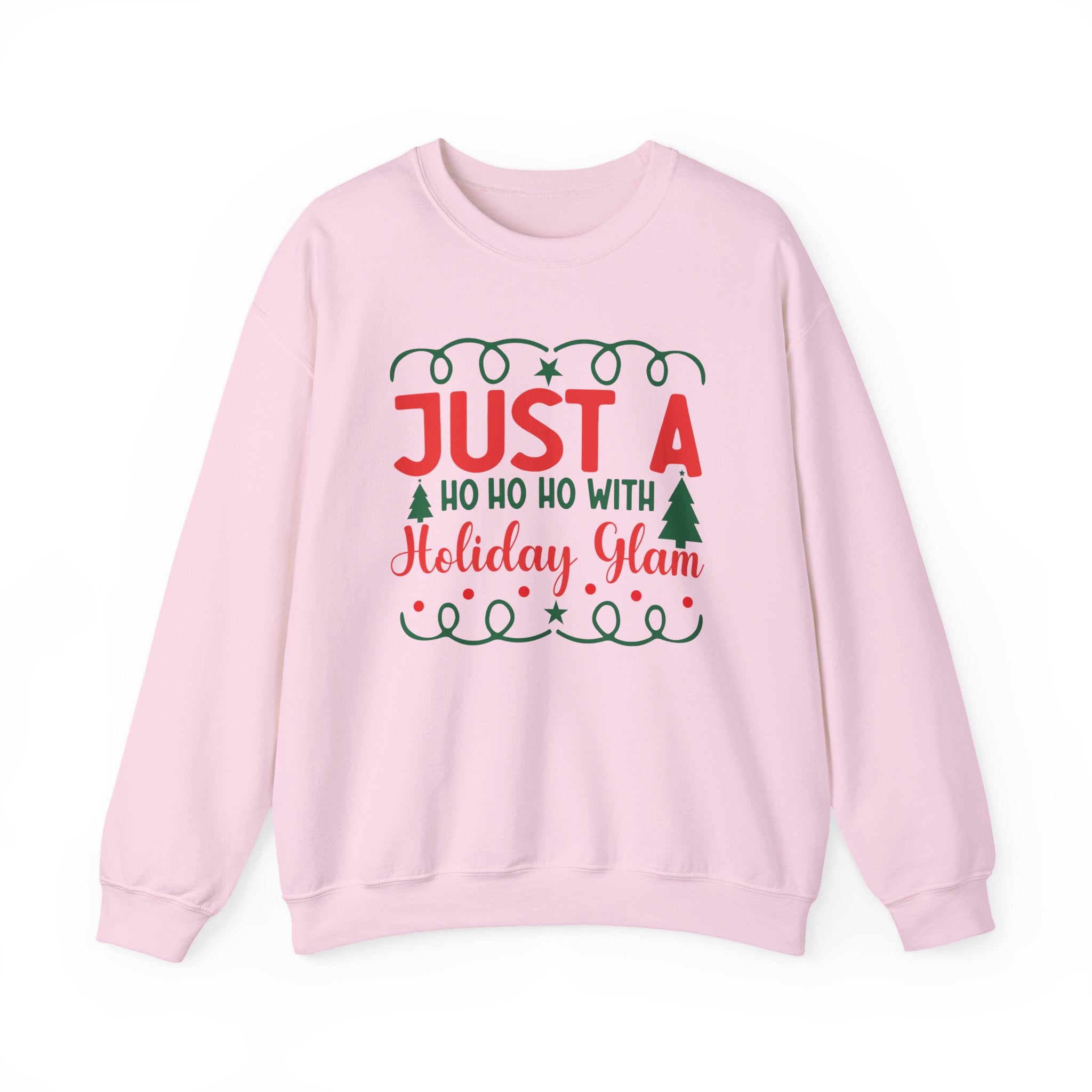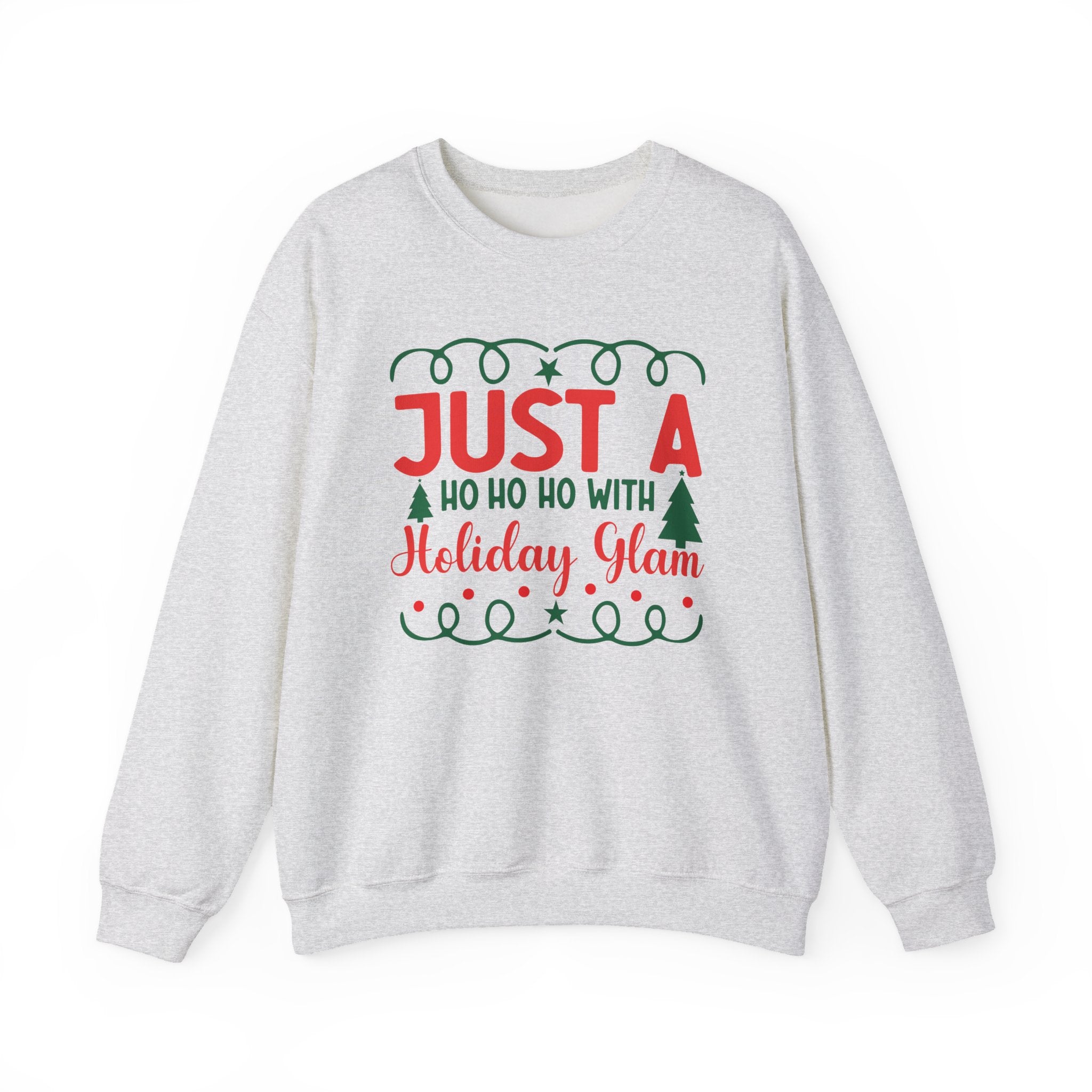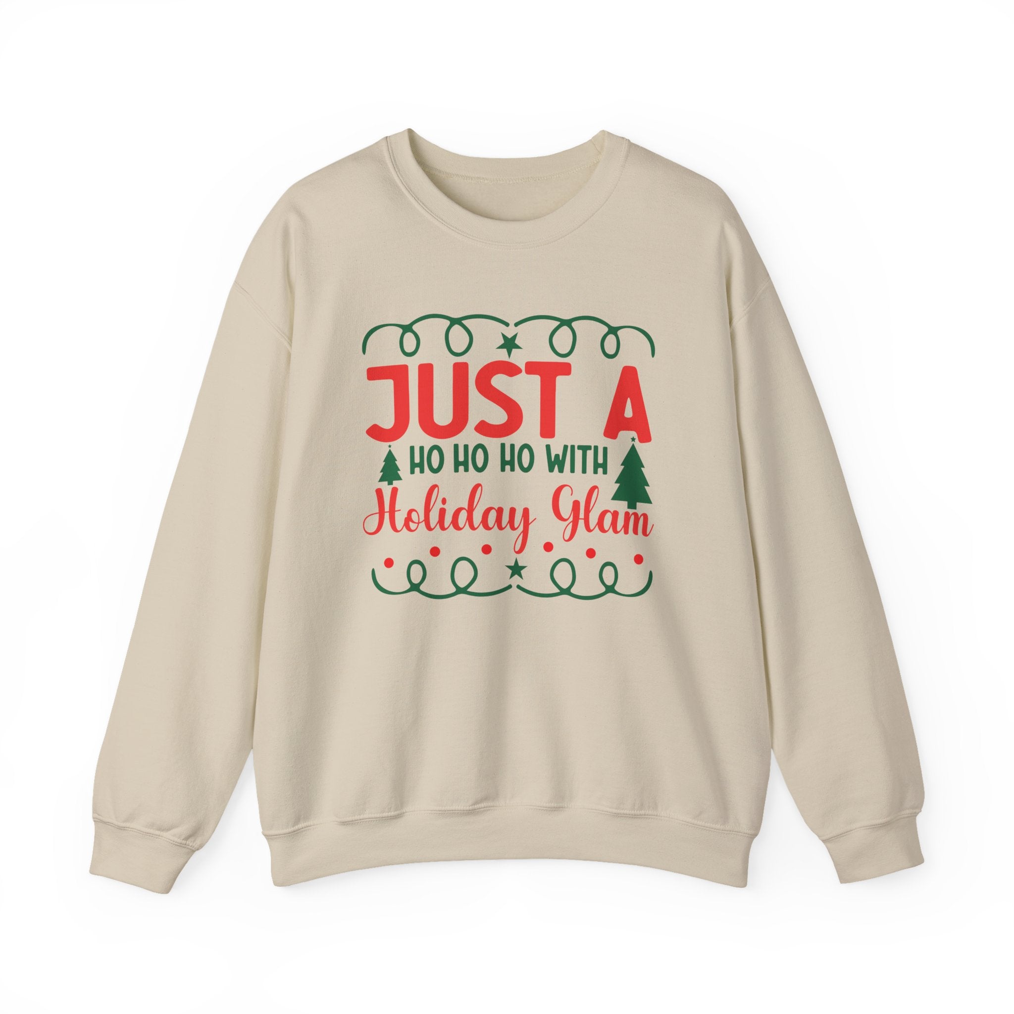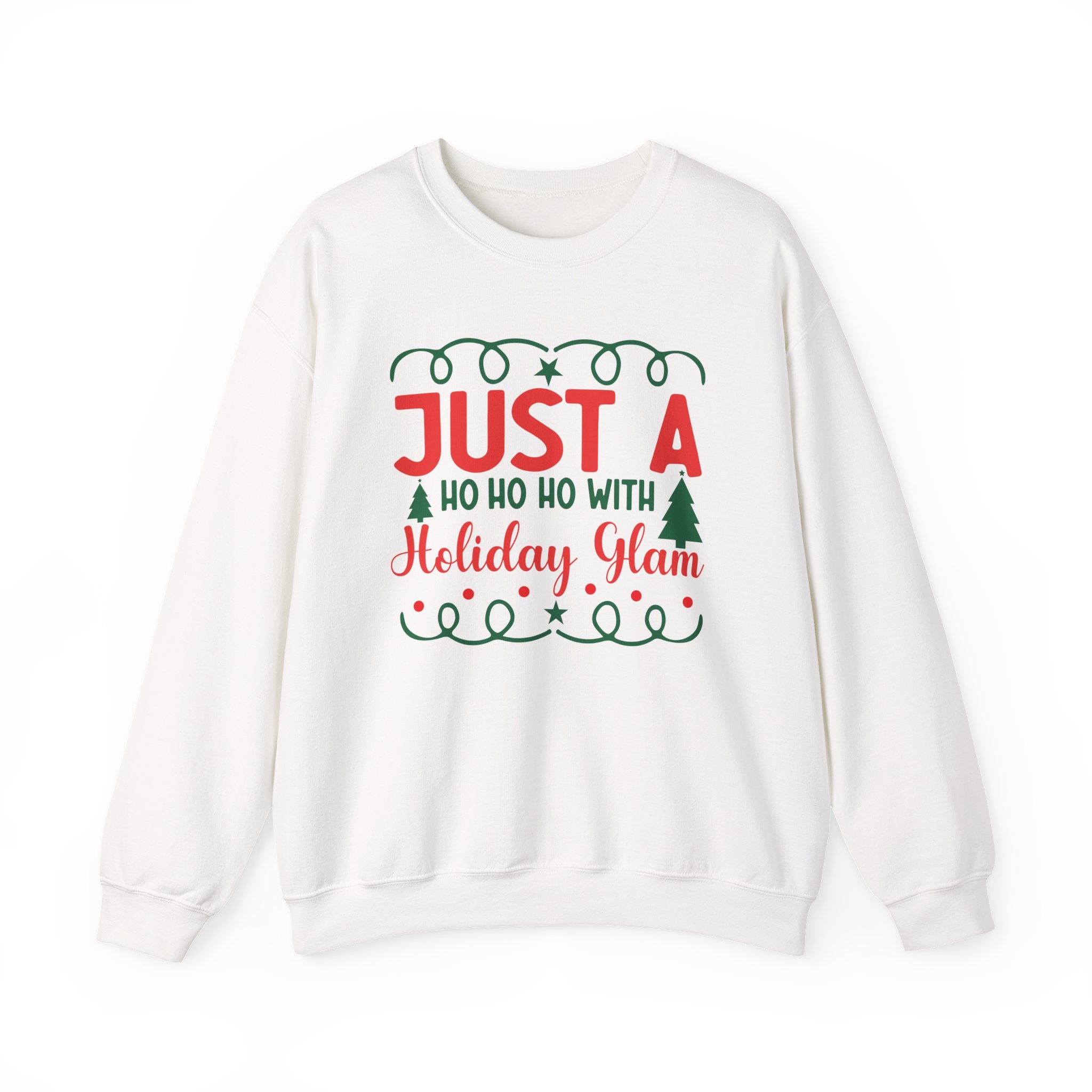 This soft, mid-weight crewneck brings cozy holiday cheer with a playful, festive graphic. The white sweatshirt features a red-and-green design that reads “JUST A HO HO HO WITH Holiday Glam,” framed by tiny trees, stars, and ornamental flourishes — a cheeky nod to anyone who loves a little sparkle during the season. The classic fit and crew neckline make it easy to layer over tees or under coats, while the smooth knit and tear-away label keep comfort front and center. Wear it to low-key family gatherings, ugly-sweater-adjacent parties, or while wrapping gifts late into the night — it’s the kind of sweatshirt that makes chilly evenings feel warm and a little more merry.Product features- Durable 50/50 cotton-poly mid-weight (8 oz/yd²) for warmth and longevity- Tubular knit construction with no side seams for a cleaner look- Ribbed collar and double-needle stitching for shape retention and strength- DTG prints with optional embroidery placements (left/center chest, wrists)- OEKO-TEX dyed, ethically sourced cotton; tear-away neck label for comfortCare instructions- Machine wash: cold (max 30C or 90F)- Non-chlorine: bleach as needed- Tumble dry: low heat- Do not iron- Do not dryclean
