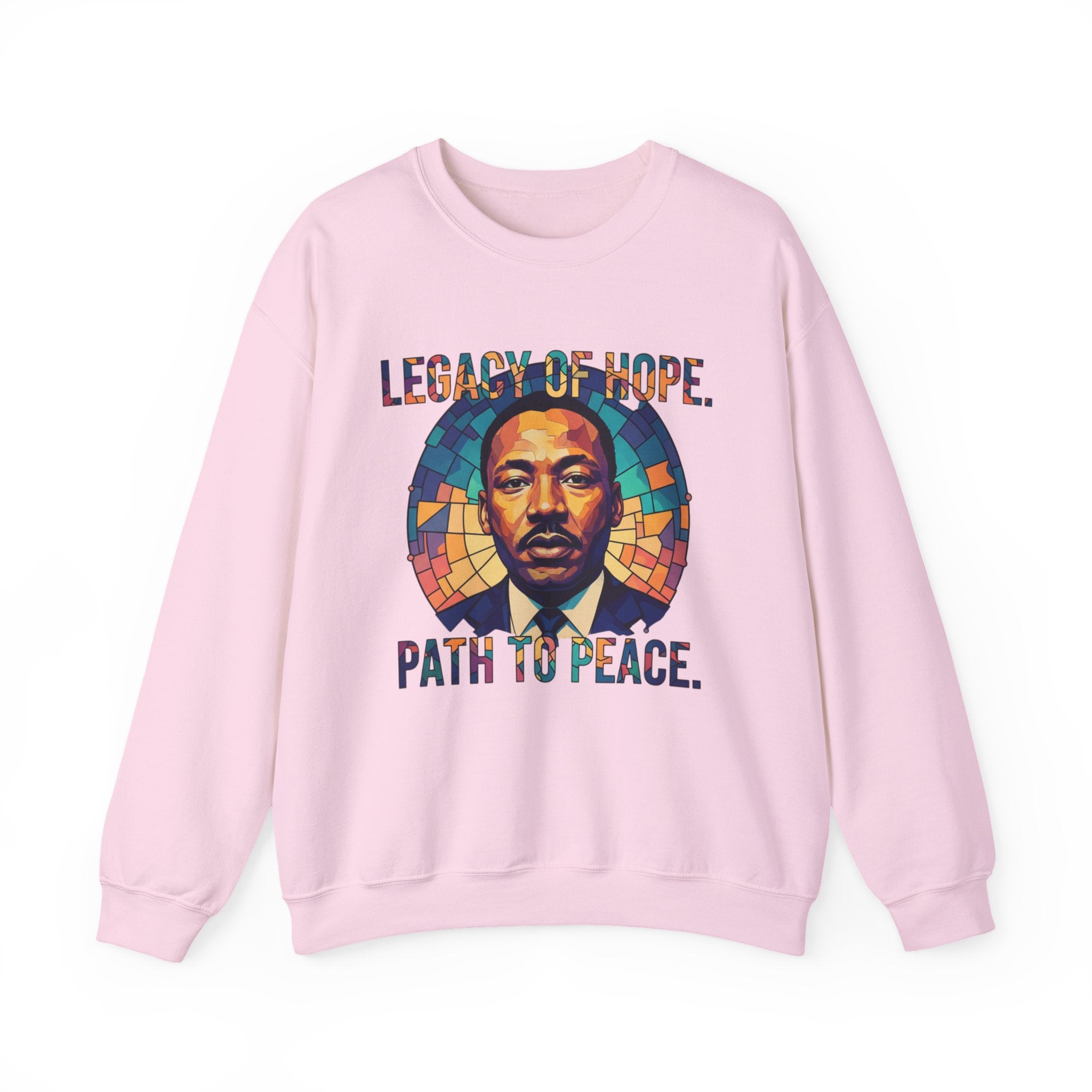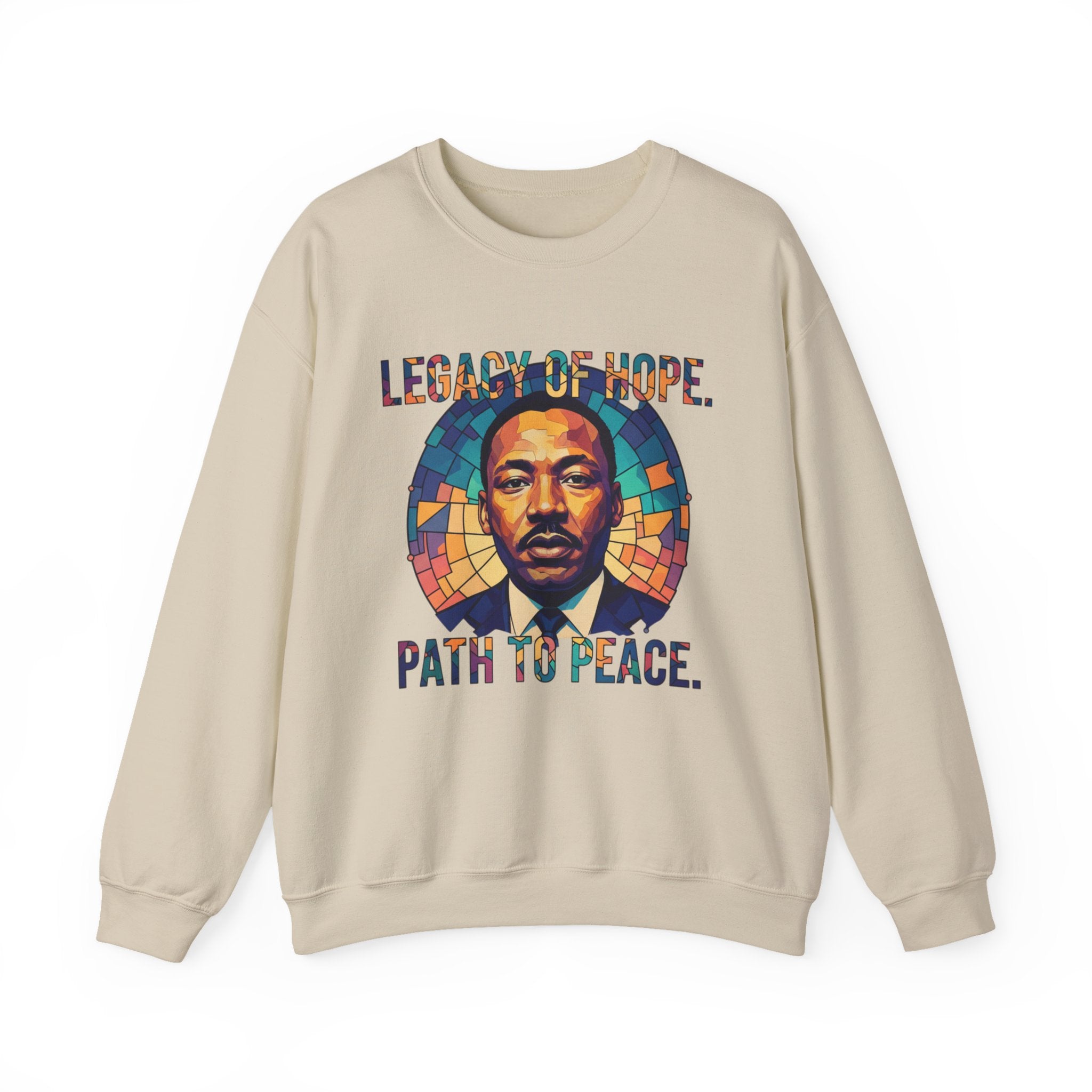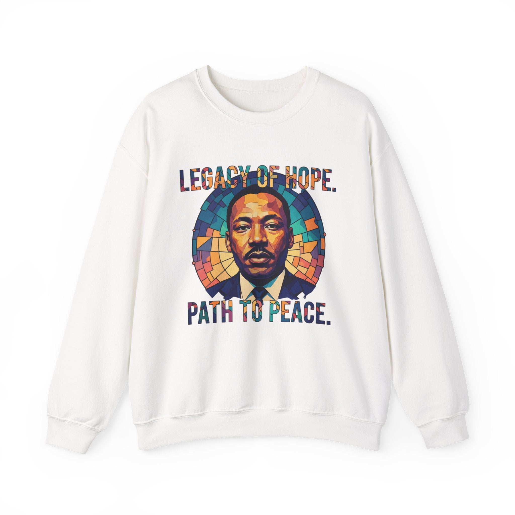 Slip into calm conviction with this crewneck sweatshirt — a thoughtful blend of art, history, and meaning. A striking stained-glass–style portrait anchors the design, framed by rich blues, golds, and warm earth tones that feel both timeless and luminous. The bold lettering above and below balances strength with reflection, giving the piece a sense of purpose without feeling heavy. Made from a medium-heavy cotton-poly blend, it offers a warm, structured feel that stays comfortable all day. Finished with clean double-needle stitching and a ribbed collar that holds its shape wear after wear, this sweatshirt is made for everyday moments — whether you’re honoring legacy, starting conversations, or carrying quiet strength into your daily routine.Product features- Medium-heavy 50/50 cotton-poly blend (8.0 oz/yd²) for warmth and durability- Classic crew neckline with ribbed knit collar to retain shape- Double-needle stitching at shoulder, armhole, neck, waistband and cuffs for long-lasting wear- Embroidered or printed decoration options (DTG/DTF) with placement choices on chest or wrists- OEKO-TEX dyes and ethically sourced cotton; tubular knit reduces fabric wasteCare instructions- Machine wash: cold (max 30C or 90F)- Non-chlorine: bleach as needed- Tumble dry: low heat- Do not iron- Do not dryclean