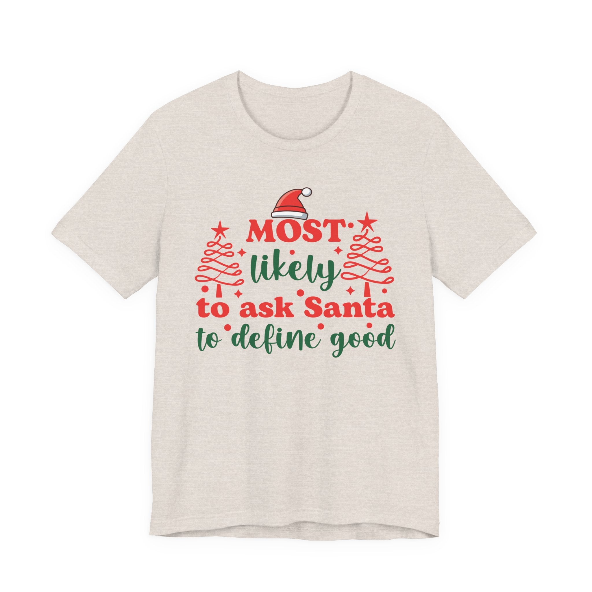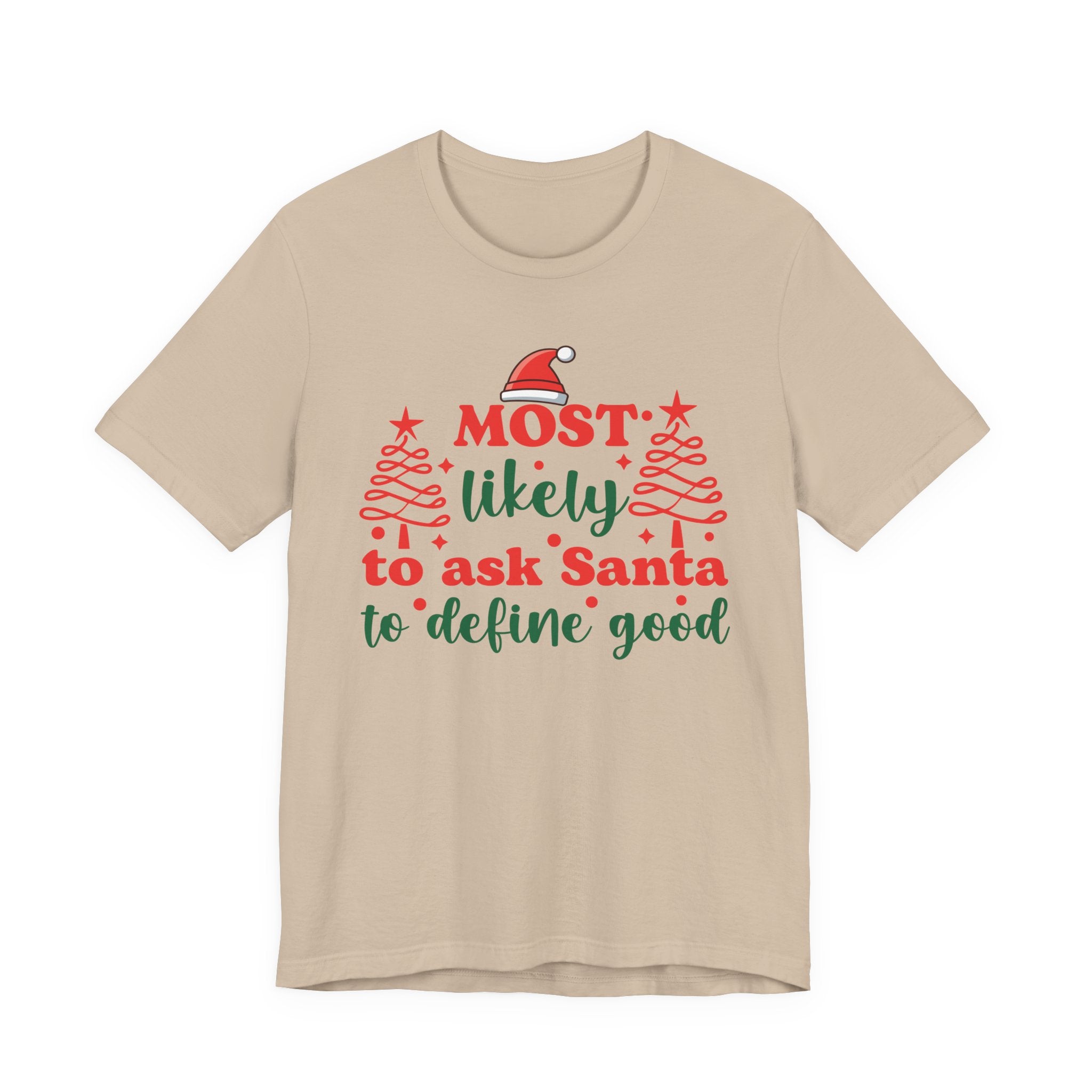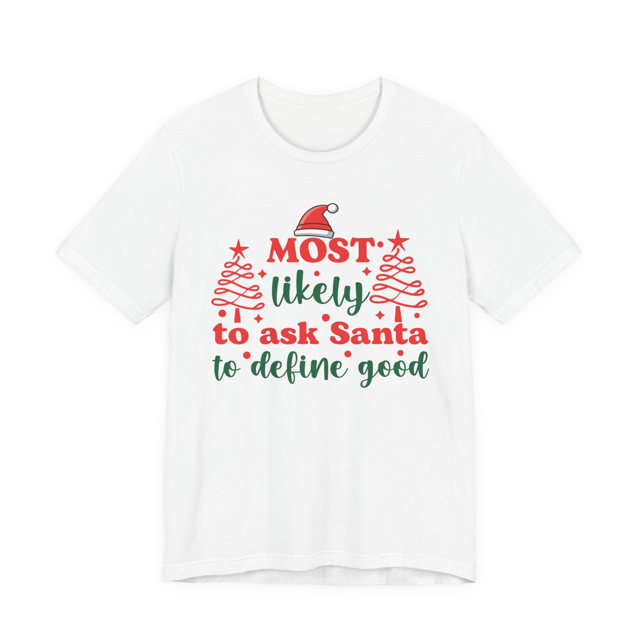 Lightweight and soft, this crew-neck tee wears like a holiday-sidekick: cheeky, comfortable, and ready for lazy mornings or loud family dinners. The playful “Most likely to ask Santa to define good” design is printed in festive reds and greens on breathable Airlume cotton, so the message stays bright without feeling stiff. It drapes with a retail fit that layers easily under sweaters or stands alone with jeans. Thoughtful construction—ribbed collar, shoulder tape, and side seams—keeps shape after repeat wears and washes. Ethically produced and REACH certified, this shirt brings spirited humor to seasonal gatherings while staying gentle on the skin thanks to the tear-away label.Slip it on when you want to laugh at yourself at cookie exchanges, brighten a tree-trimming night, or join in on laid-back holiday photos. The design’s crisp sleeve and neck prints hold up with modern DTF/DTG methods, so the colors stay lively across the season.Product features- 100% Airlume combed ring-spun cotton (lightweight 4.2 oz) for breathable comfort- Ribbed knit collar and shoulder tape for lasting shape and reduced stretching- Side seams for improved structure and a neat retail fit- Crisp, durable print using DTF/DTG methods; tear-away neck label for comfort- REACH certified; ethically sourced manufacturing (Bella+Canvas, Honduras)Care instructions- Machine wash: cold (max 30C or 90F)- Non-chlorine: bleach as needed- Tumble dry: low heat- Iron, steam or dry: medium heat- Do not dryclean