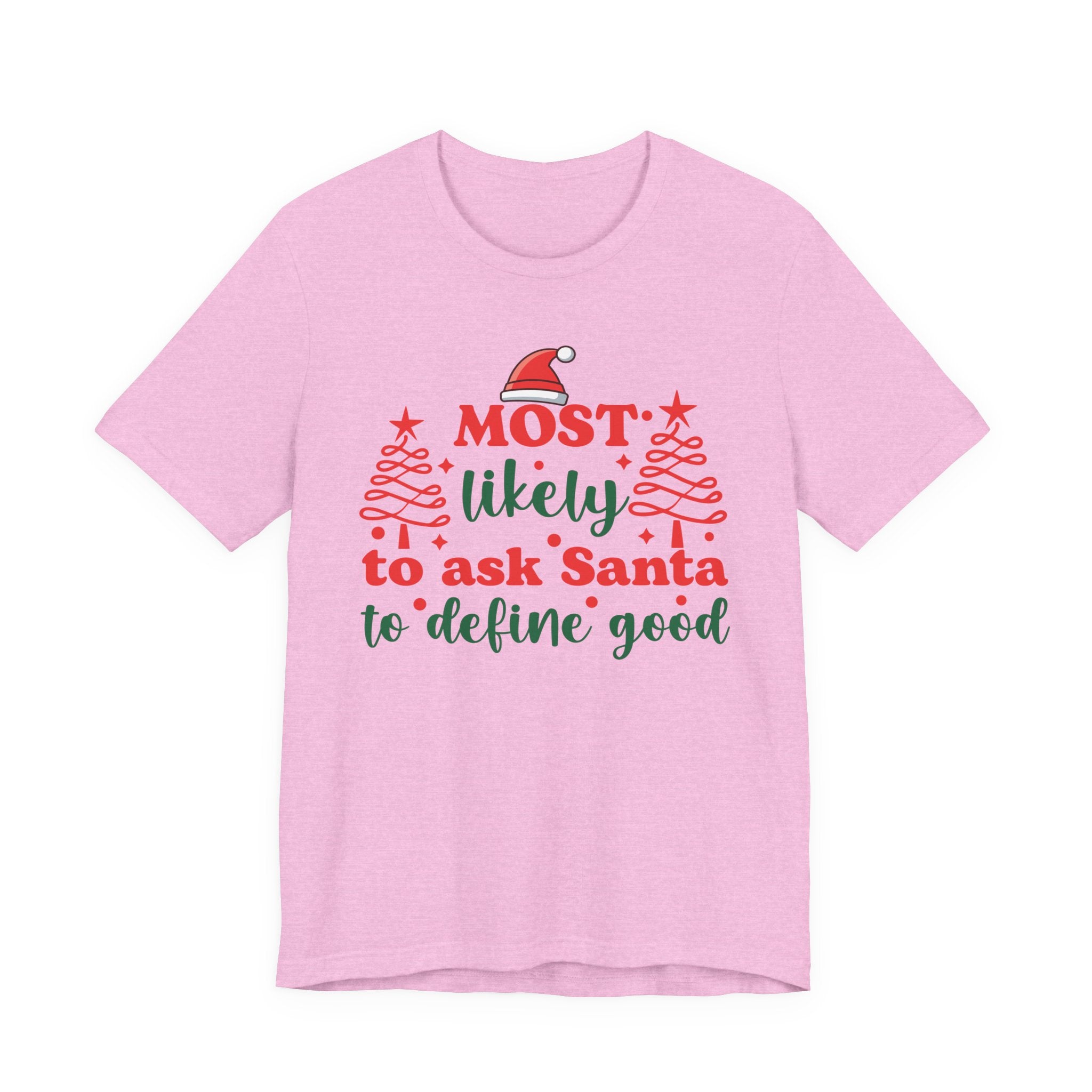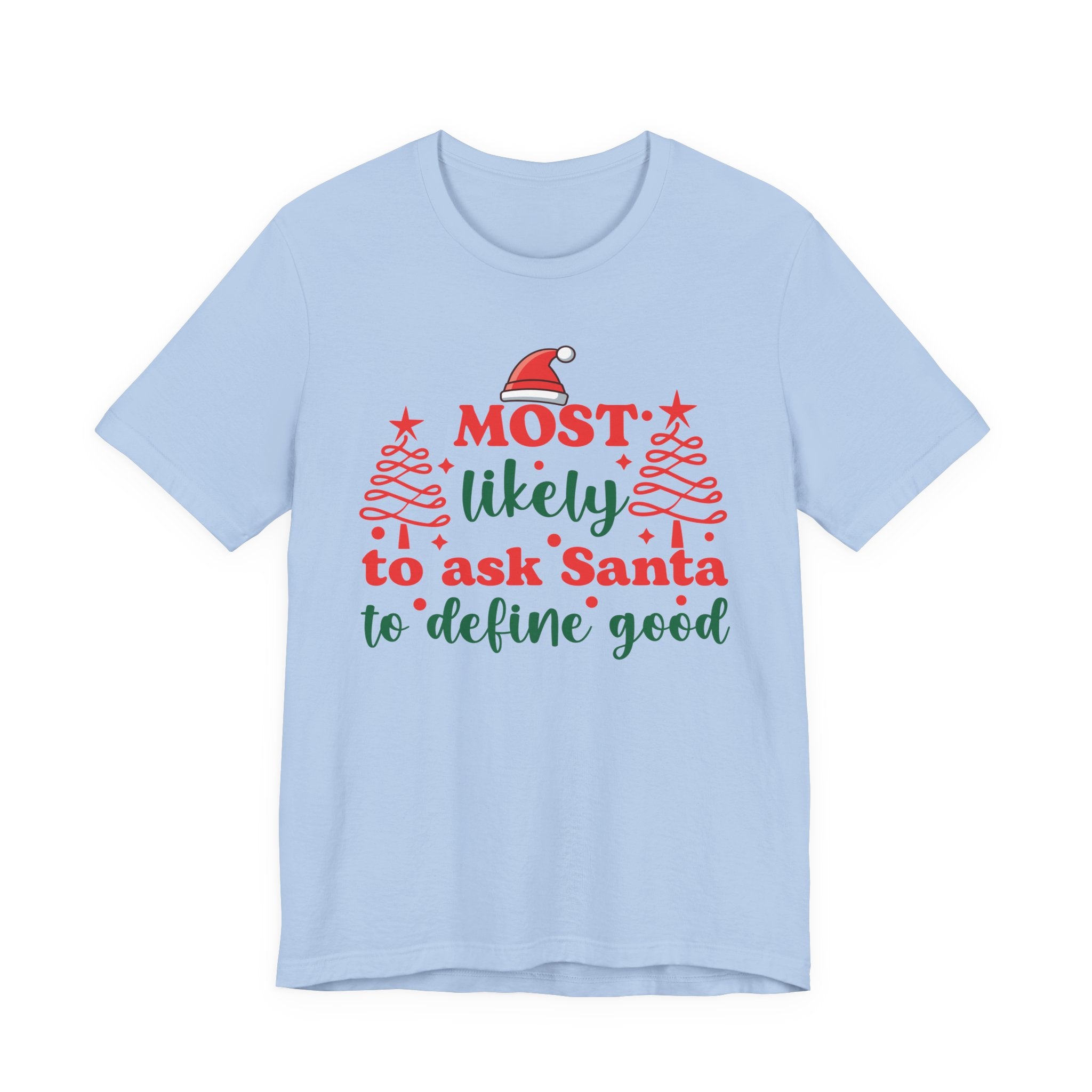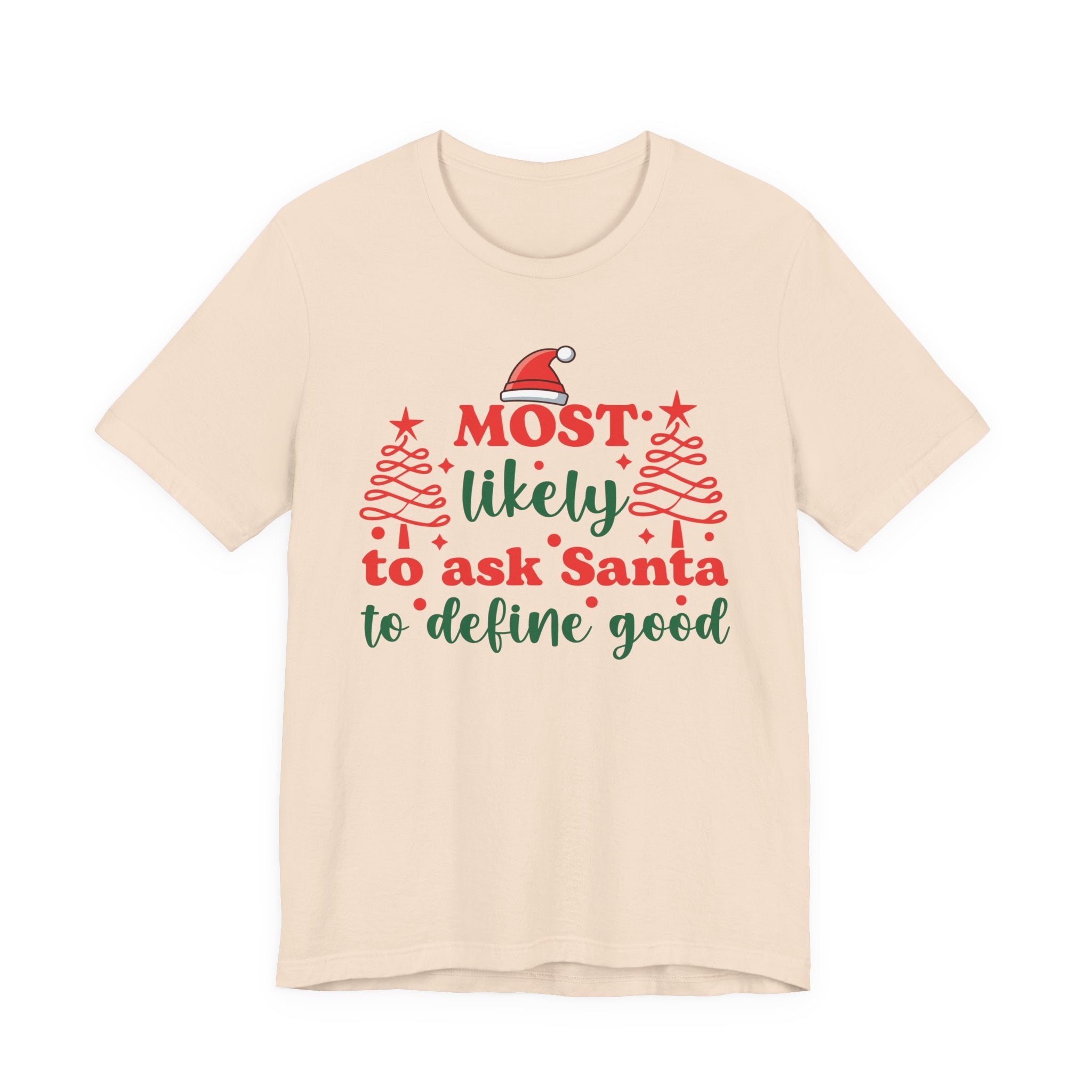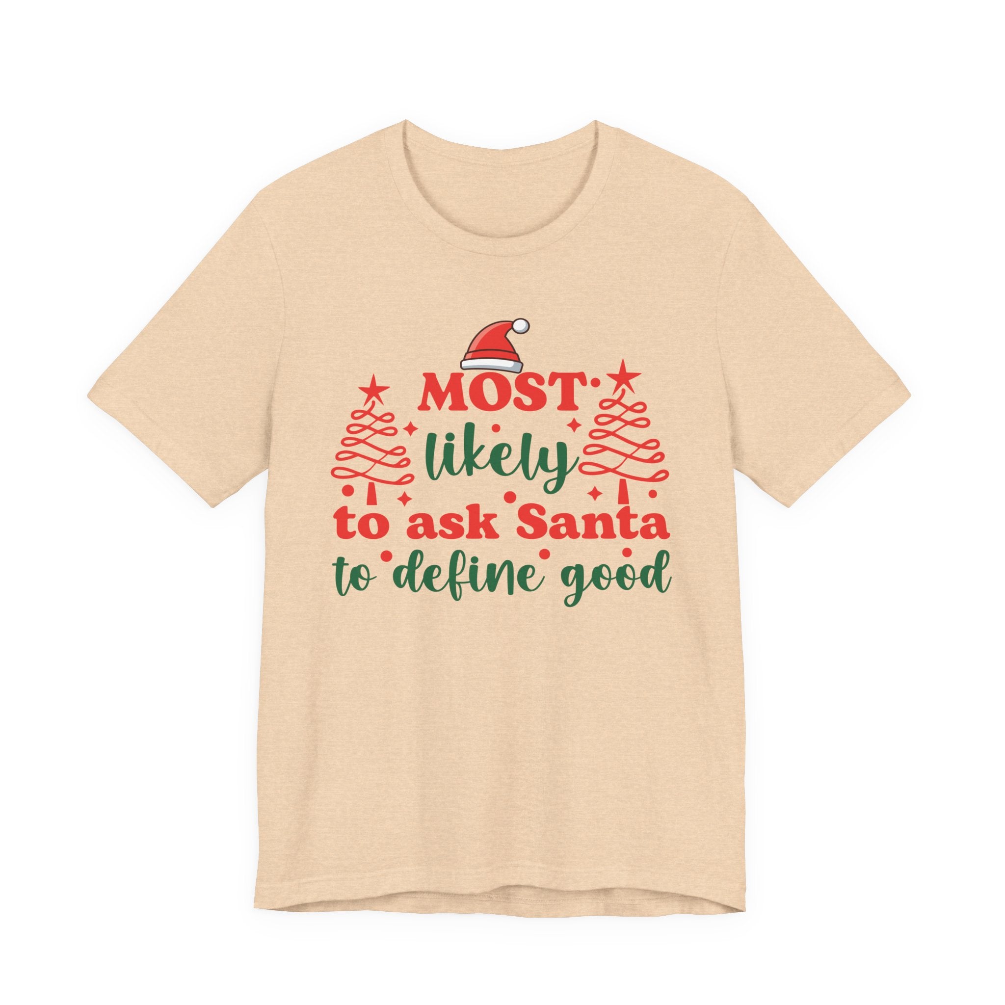 Lightweight and soft, this crew-neck tee wears like a holiday-sidekick: cheeky, comfortable, and ready for lazy mornings or loud family dinners. The playful “Most likely to ask Santa to define good” design is printed in festive reds and greens on breathable Airlume cotton, so the message stays bright without feeling stiff. It drapes with a retail fit that layers easily under sweaters or stands alone with jeans. Thoughtful construction—ribbed collar, shoulder tape, and side seams—keeps shape after repeat wears and washes. Ethically produced and REACH certified, this shirt brings spirited humor to seasonal gatherings while staying gentle on the skin thanks to the tear-away label.Slip it on when you want to laugh at yourself at cookie exchanges, brighten a tree-trimming night, or join in on laid-back holiday photos. The design’s crisp sleeve and neck prints hold up with modern DTF/DTG methods, so the colors stay lively across the season.Product features- 100% Airlume combed ring-spun cotton (lightweight 4.2 oz) for breathable comfort- Ribbed knit collar and shoulder tape for lasting shape and reduced stretching- Side seams for improved structure and a neat retail fit- Crisp, durable print using DTF/DTG methods; tear-away neck label for comfort- REACH certified; ethically sourced manufacturing (Bella+Canvas, Honduras)Care instructions- Machine wash: cold (max 30C or 90F)- Non-chlorine: bleach as needed- Tumble dry: low heat- Iron, steam or dry: medium heat- Do not dryclean