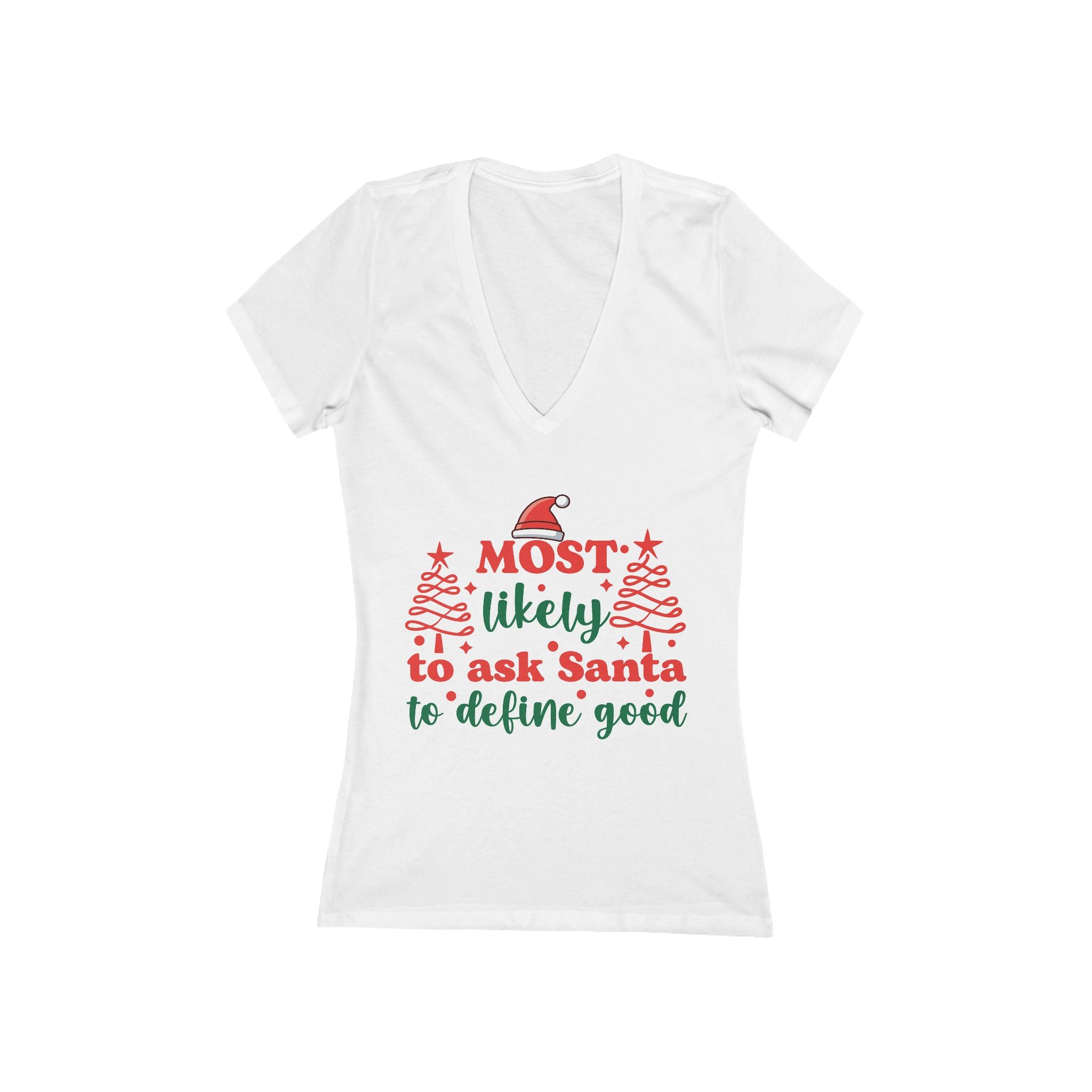 Light, playful, and made for holiday mischief — this slim-fit deep V tee carries a cheeky Christmas print that reads “Most likely to ask Santa to define good.” Soft and lightweight, it layers easily under sweaters or wears solo for eggnog nights and tree-trimming sessions. The narrow cut and deep neckline feel feminine and modern, flattering those who like a closer fit while keeping movement easy. The ribbed collar and shoulder tape hold shape through festive wear, and side seams give the shirt a tailored silhouette that sits neatly at the hips. Wear it to cozy gatherings, ugly-sweater alternatives, or casual holiday photos where personality matters more than perfection.Product features- Lightweight 4.2 oz fabric for breathable all-day comfort- Slim fit with side seams for a flattering, tailored silhouette- Ribbed knit collar and shoulder tape to retain shape and prevent stretching- High-quality Airlume combed and ring-spun cotton (fiber mix varies by color)- Sewn-in label; note: runs smaller than usual — consider sizing upCare instructions- Machine wash: warm (max 40C or 105F)- Non-chlorine: bleach as needed- Tumble dry: low heat- Iron, steam or dry: medium heat- Do not dryclean