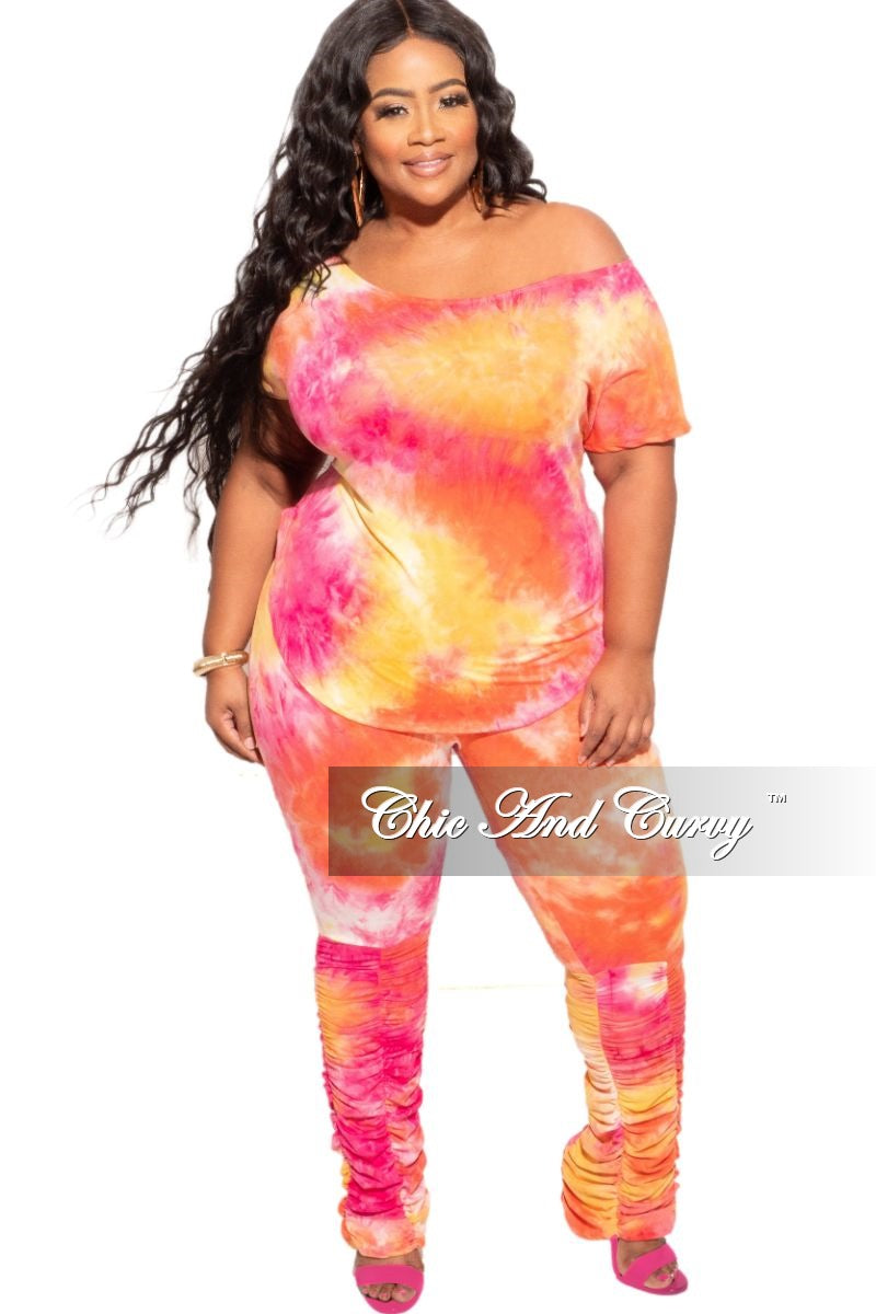 New Plus Size 2-Piece Set Wide Neck Top and Ruched Pants in Fuchsia and Orange Tie Dye