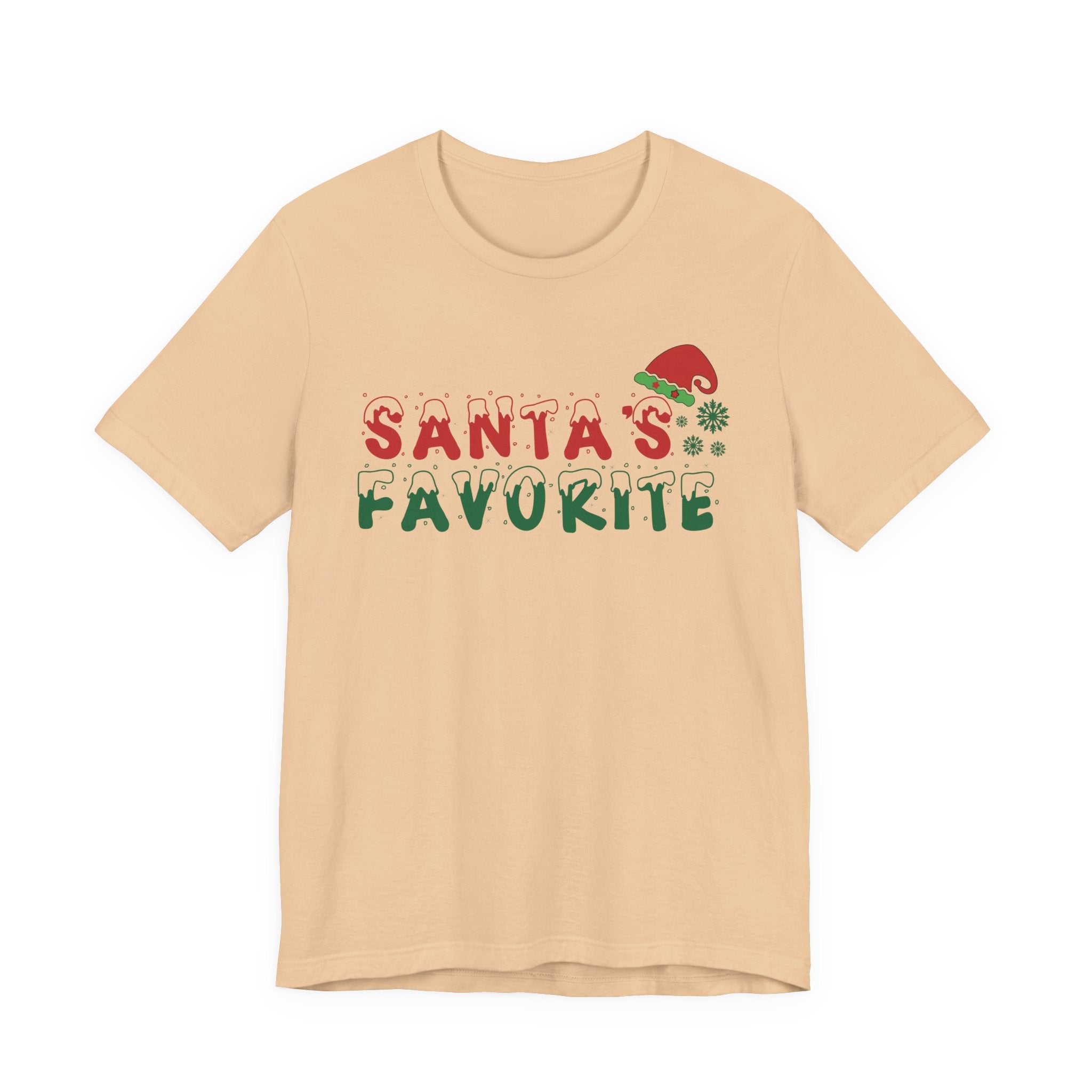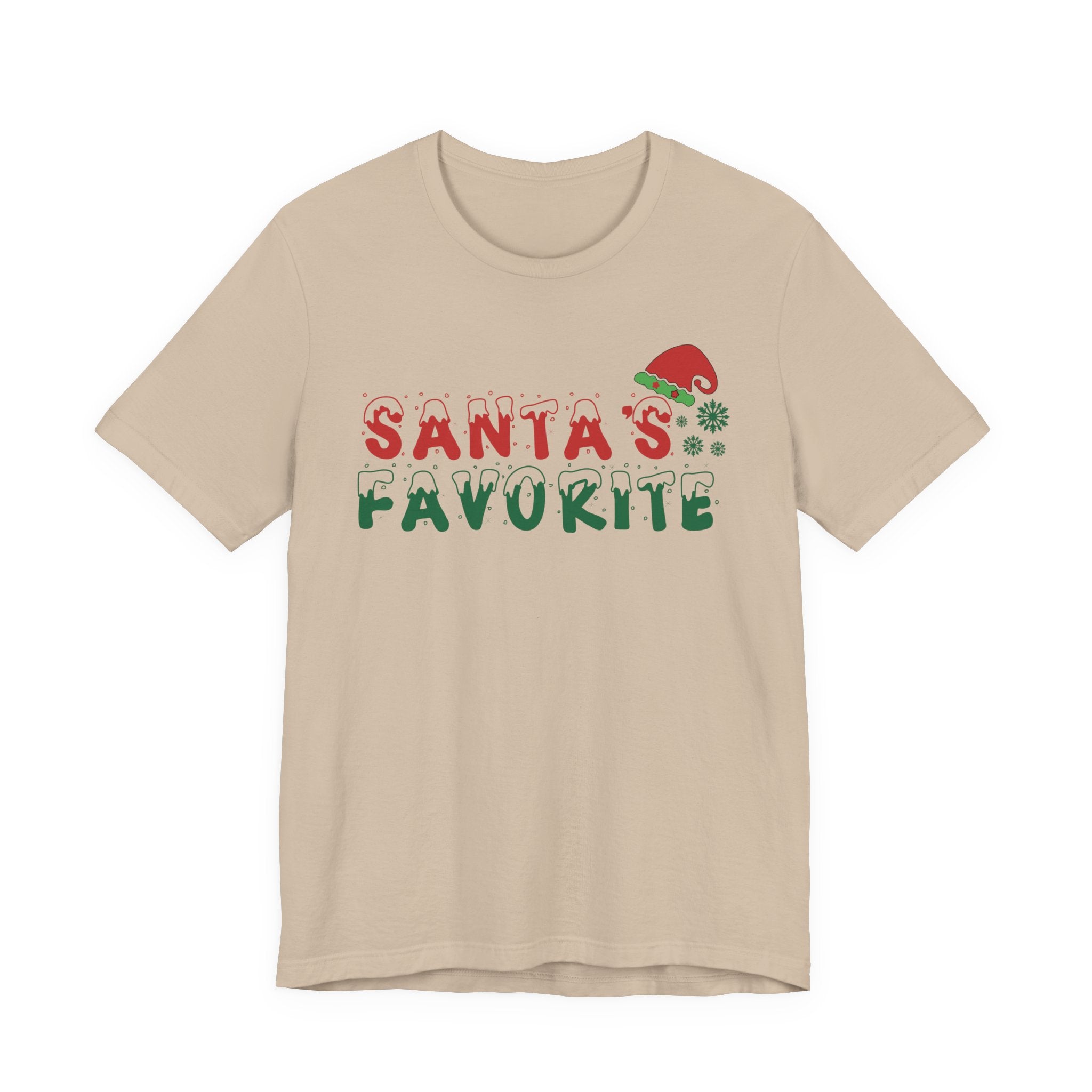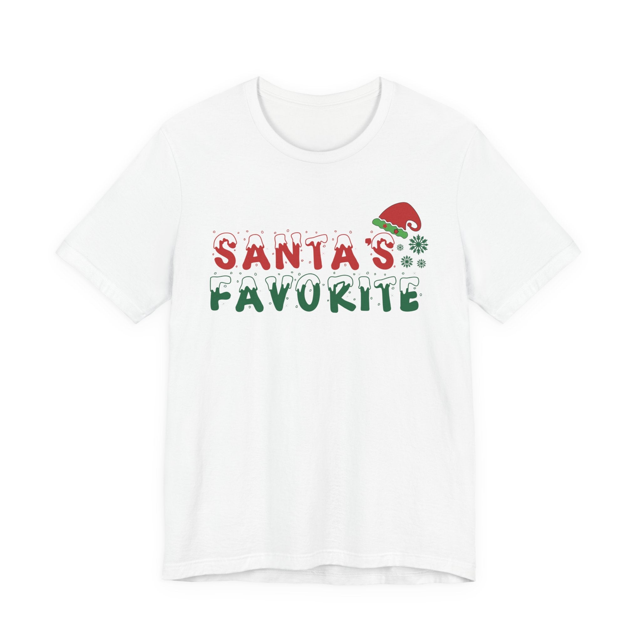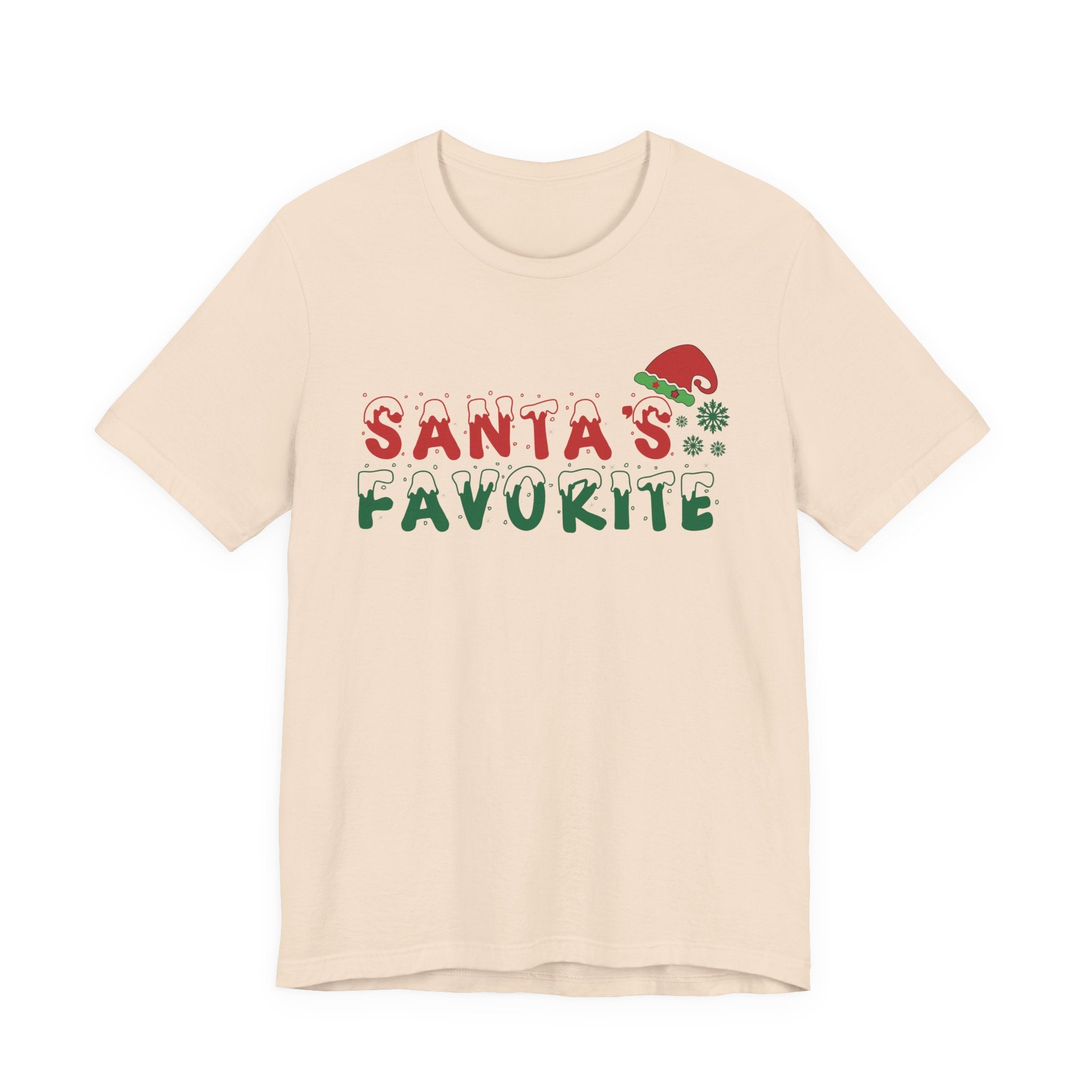 A lightweight, breathable tee that channels playful holiday cheer. The shirt shows “SANTA’S FAVORITE” in red and green with a small Santa hat and snowflake flourish, giving a whimsical, slightly cheeky holiday look. The soft Airlume combed and ring‑spun cotton feels smooth against skin and layers easily under jackets or cozy overcards. Thoughtful construction — side seams, shoulder tape, and a ribbed knit collar — keeps the silhouette neat wash after wash. Made and sourced with ethical standards in mind, this tee brings comfortable, festive style to casual gatherings, family photos, and low-key Christmas parties.Product features- 100% Airlume combed & ring-spun cotton (lightweight 4.2 oz) for breathable comfort- Side seams and shoulder tape for long-lasting shape and stability- Ribbed knit collar with seam and tear-away label to reduce irritation- Printed details (front and sleeves) produced with DTF/DTG methods for crisp, vibrant graphics- REACH certified; Bella+Canvas sourcing with humane manufacturing and Fair Labor Association complianceCare instructions- Machine wash: cold (max 30C or 90F)- Non-chlorine: bleach as needed- Tumble dry: low heat- Iron, steam or dry: medium heat- Do not dryclean
