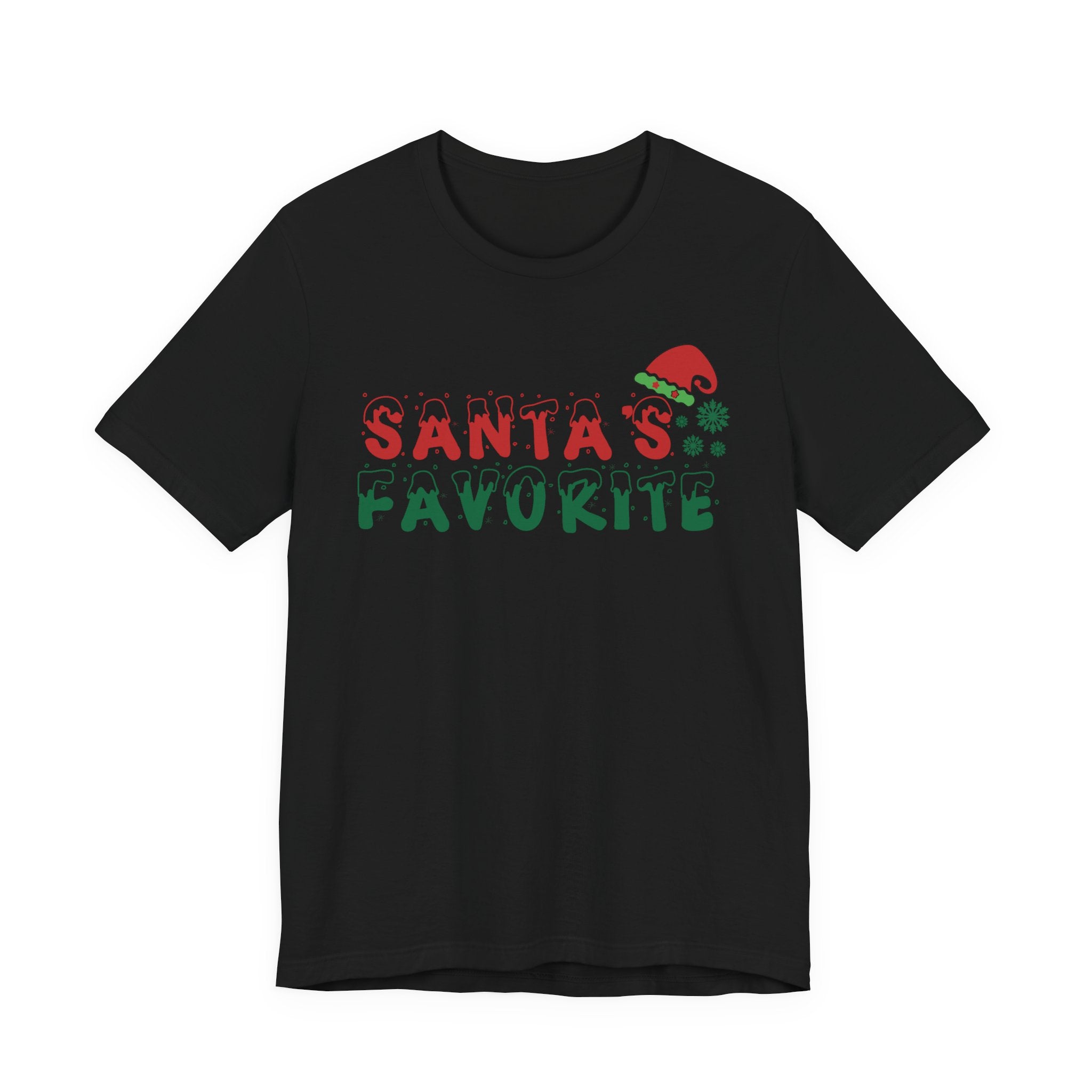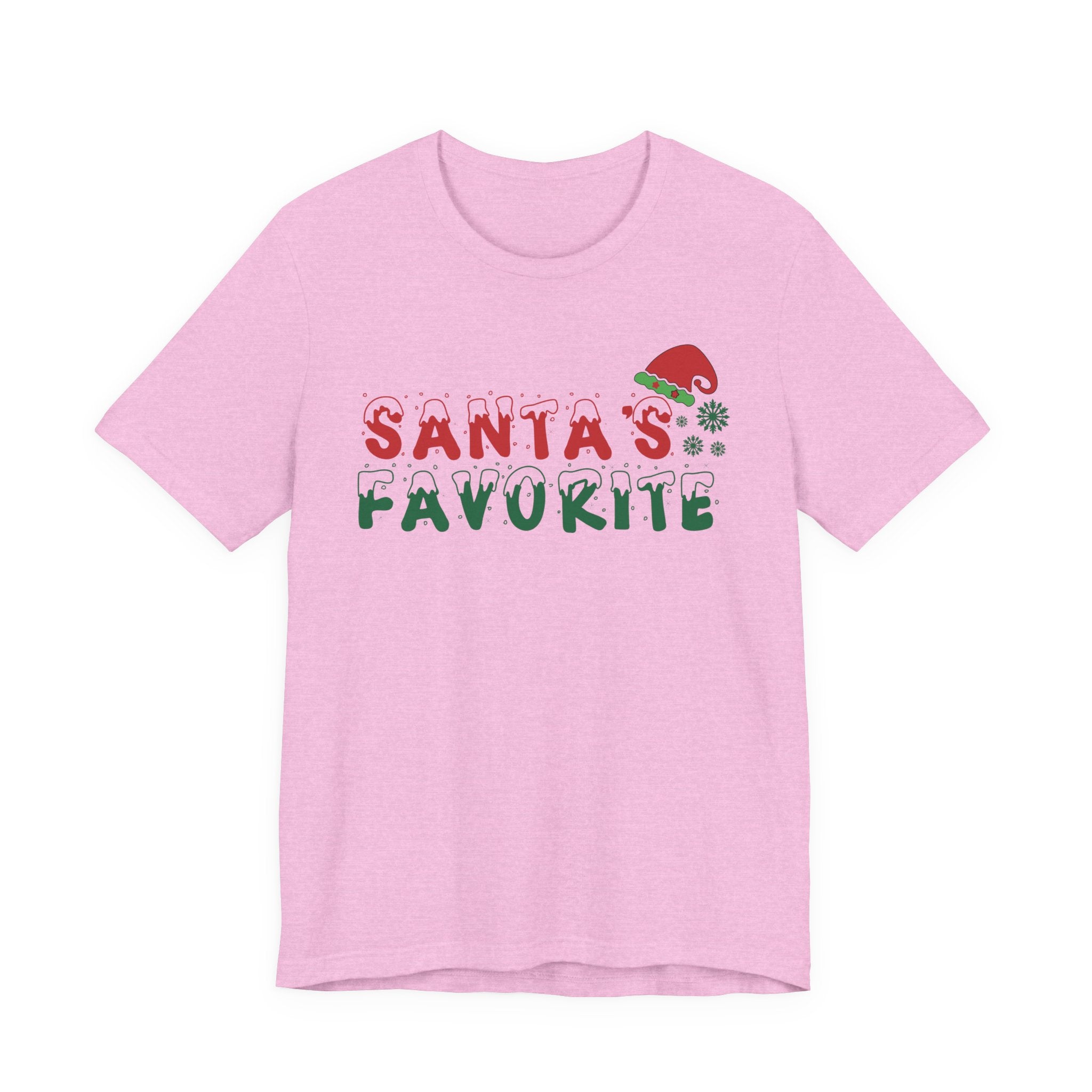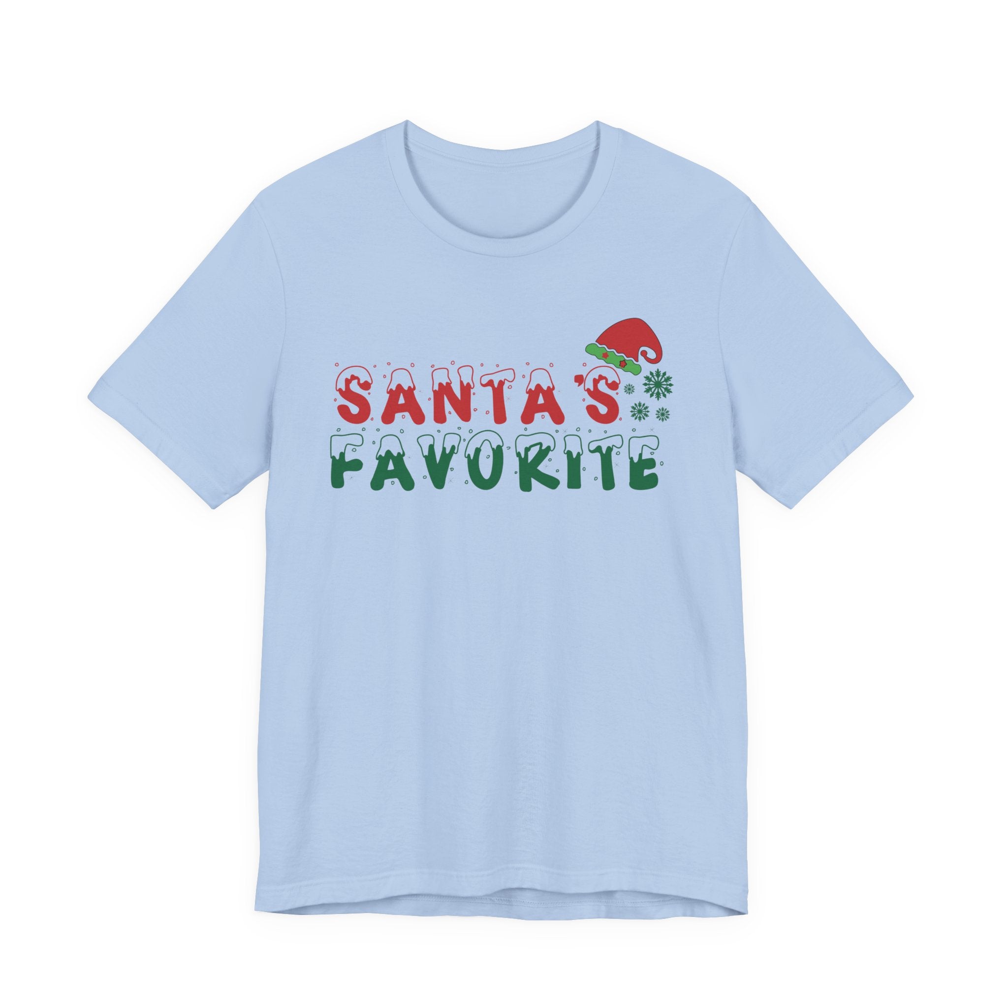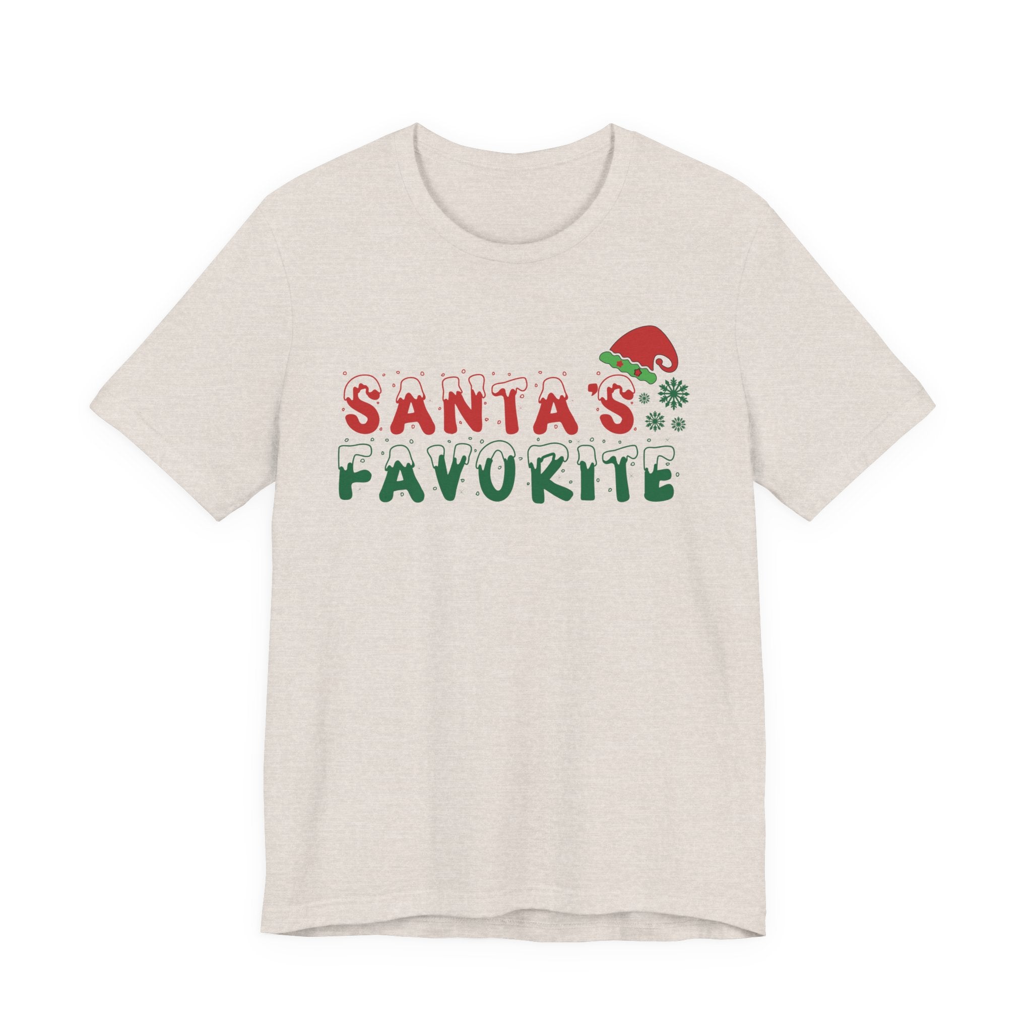 A lightweight, breathable tee that channels playful holiday cheer. The shirt shows “SANTA’S FAVORITE” in red and green with a small Santa hat and snowflake flourish, giving a whimsical, slightly cheeky holiday look. The soft Airlume combed and ring‑spun cotton feels smooth against skin and layers easily under jackets or cozy overcards. Thoughtful construction — side seams, shoulder tape, and a ribbed knit collar — keeps the silhouette neat wash after wash. Made and sourced with ethical standards in mind, this tee brings comfortable, festive style to casual gatherings, family photos, and low-key Christmas parties.Product features- 100% Airlume combed & ring-spun cotton (lightweight 4.2 oz) for breathable comfort- Side seams and shoulder tape for long-lasting shape and stability- Ribbed knit collar with seam and tear-away label to reduce irritation- Printed details (front and sleeves) produced with DTF/DTG methods for crisp, vibrant graphics- REACH certified; Bella+Canvas sourcing with humane manufacturing and Fair Labor Association complianceCare instructions- Machine wash: cold (max 30C or 90F)- Non-chlorine: bleach as needed- Tumble dry: low heat- Iron, steam or dry: medium heat- Do not dryclean