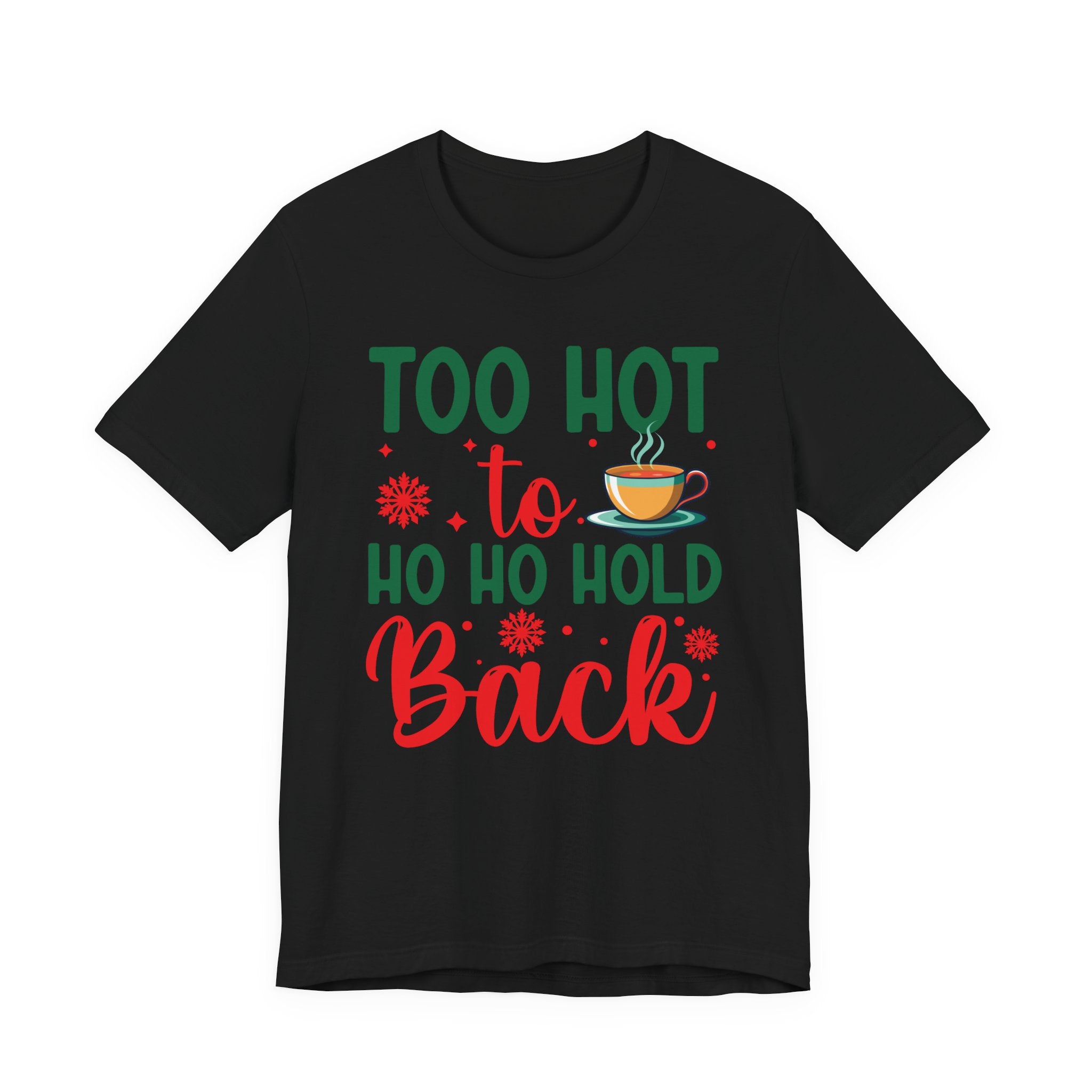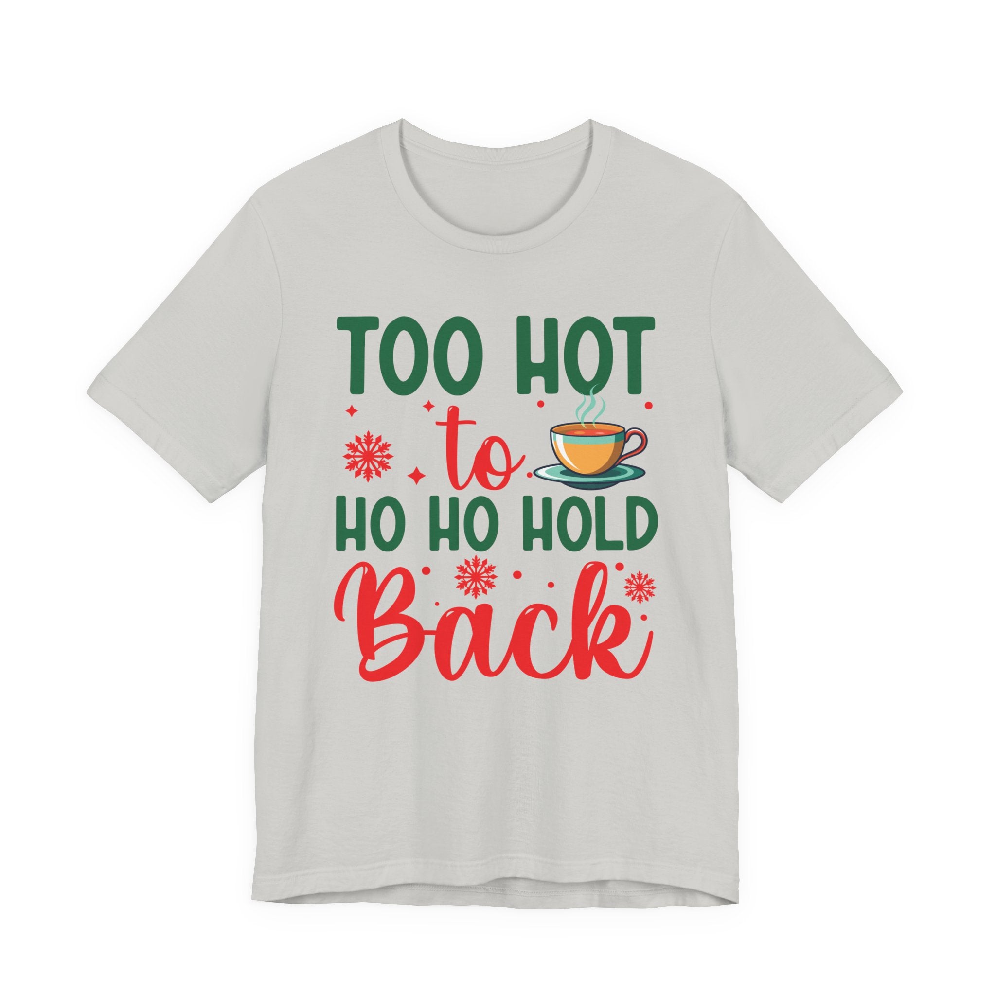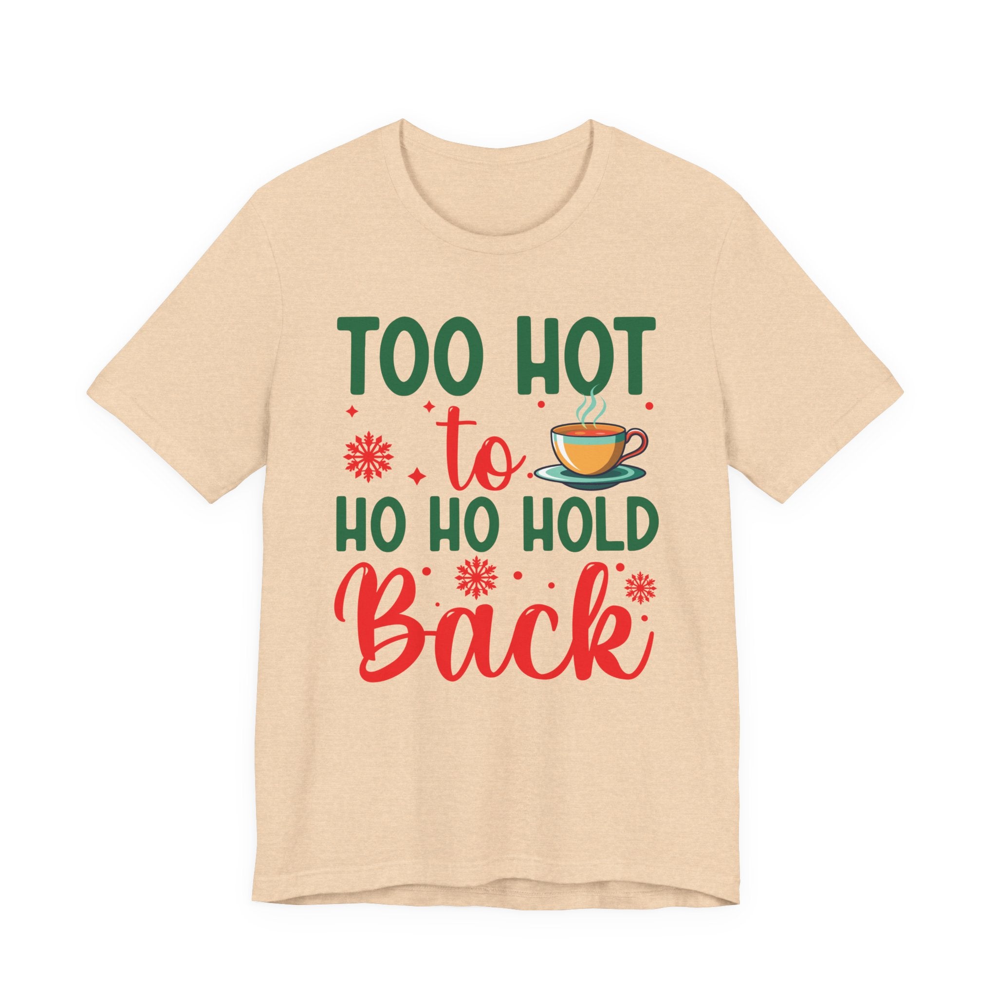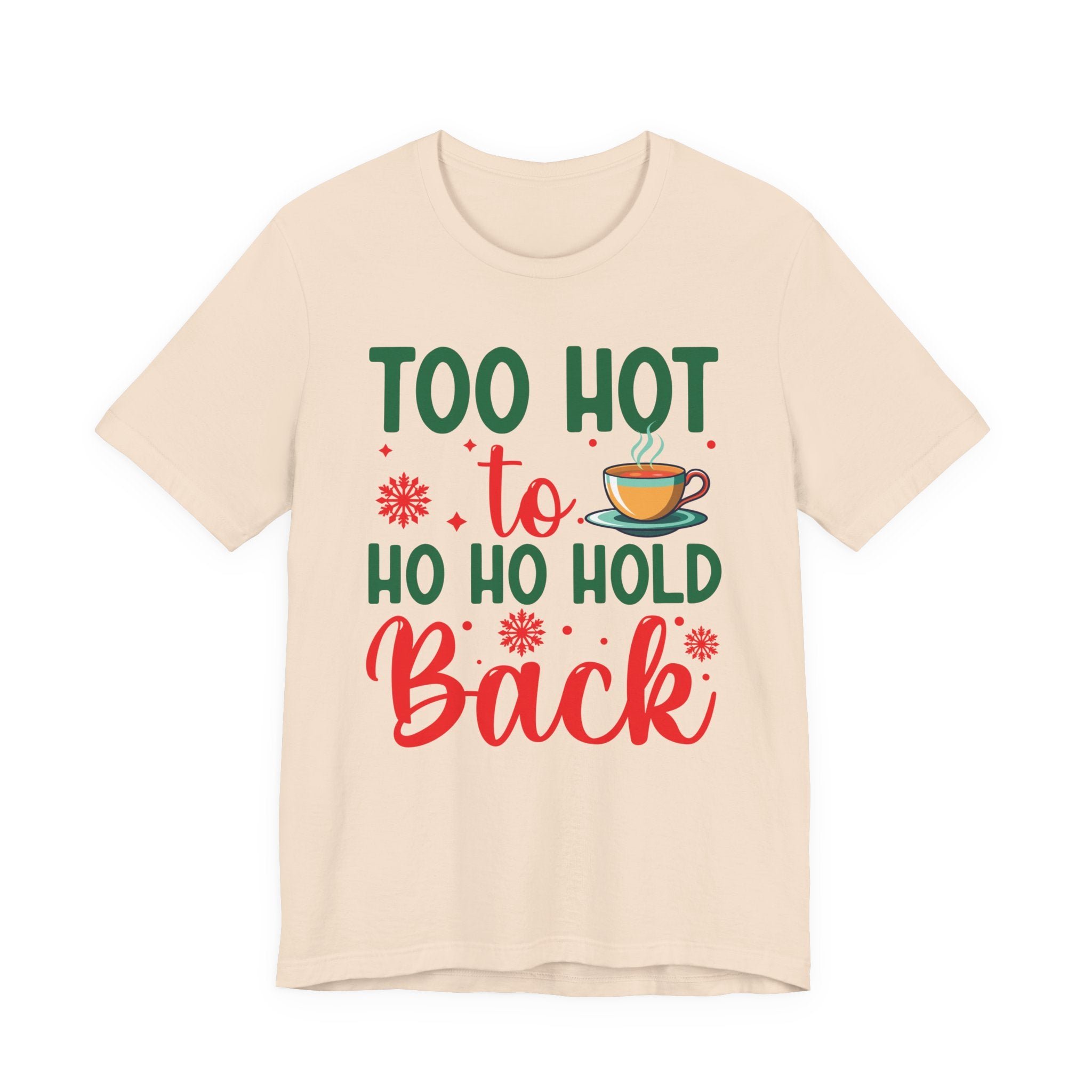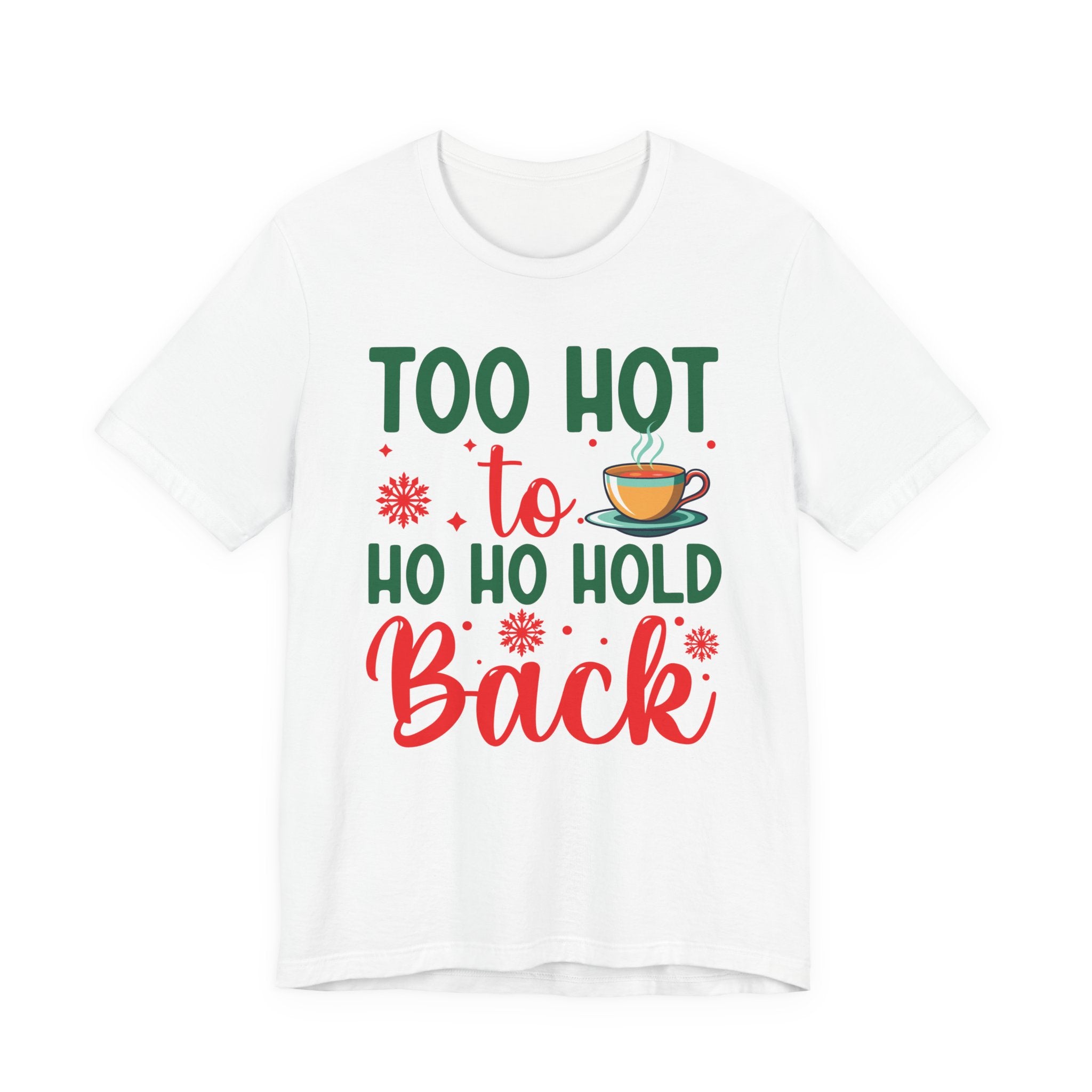This lightweight jersey tee brings a playful, cozy energy to casual holiday wardrobes. The front graphic reads “Too hot to ho ho hold back” in festive greens and reds with a steaming mug accent — a wink at holiday gatherings, cocoa runs, and chilly nights warmed by laughter. The shirt drapes cleanly with a crew neckline and retail fit that layers easily under jackets or wears alone. Breathable Airlume combed ring‑spun cotton keeps you comfortable during brisk winter markets or relaxed family evenings. Thoughtfully constructed with side seams, shoulder tape, and a ribbed knit collar to hold its shape through many washes. Ethically produced and REACH certified, it blends seasonal cheer with wearability.Product features- 100% Airlume combed & ring-spun cotton (lightweight 4.2 oz) for breathability and soft handfeel- Retail crew-neck fit with ribbed knit collar and tear-away label for comfort and easy layering- Built for durability: side seams and shoulder tape stabilize shape and prevent stretching- Print quality: sleeve and neck label options use DTF or DTG methods for crisp, vibrant designs- Ethical & compliant: REACH certified; blank sourced from Honduras; Bella+Canvas production standards and certificationsCare instructions- Machine wash: cold (max 30C or 90F)- Non-chlorine: bleach as needed- Tumble dry: low heat- Iron, steam or dry: medium heat- Do not dryclean